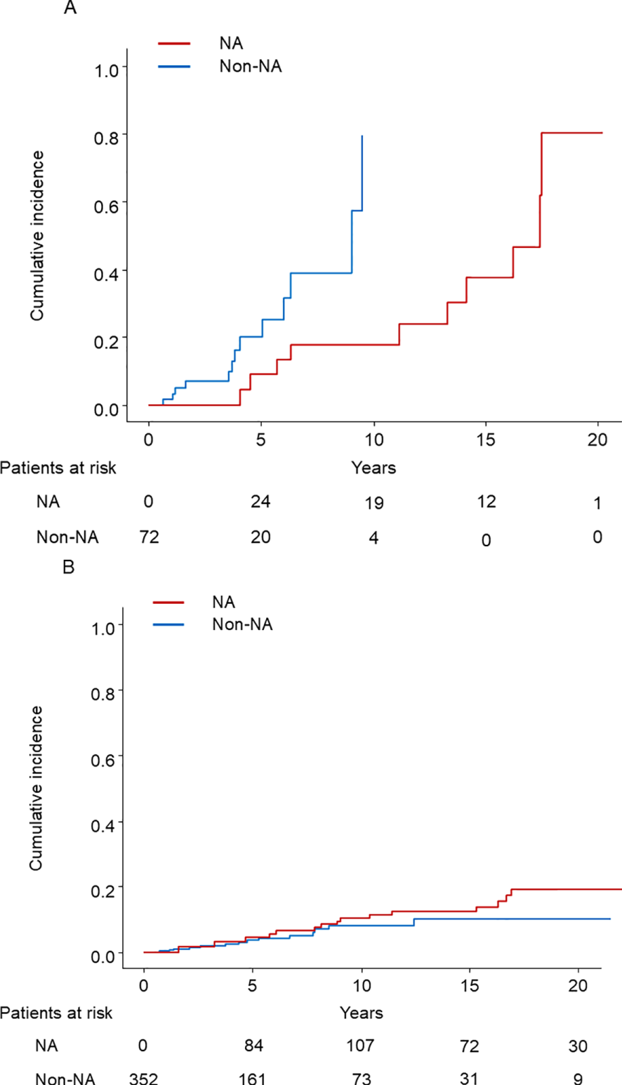 In the entire cohort, 78 patients developed HCC: 38 in the NA group and 40 in the non-NA group. In the PSM cohort, during the mean follow-up of 12.9 and 6.8 years in the NA and non-NA groups, respectively, 25 patients of the NA group and 28 of the non-NA group developed HCC. The cumulative incidence rates of HCC development by Kaplan–Meier analysis at 5 and 10 years were 6.0%, and 12.7%, respectively (Figure 2A). The survival curves determined for NA use and non-use (time-dependent covariate) using the Simon and Makuch method are shown in Figure 2B (28).