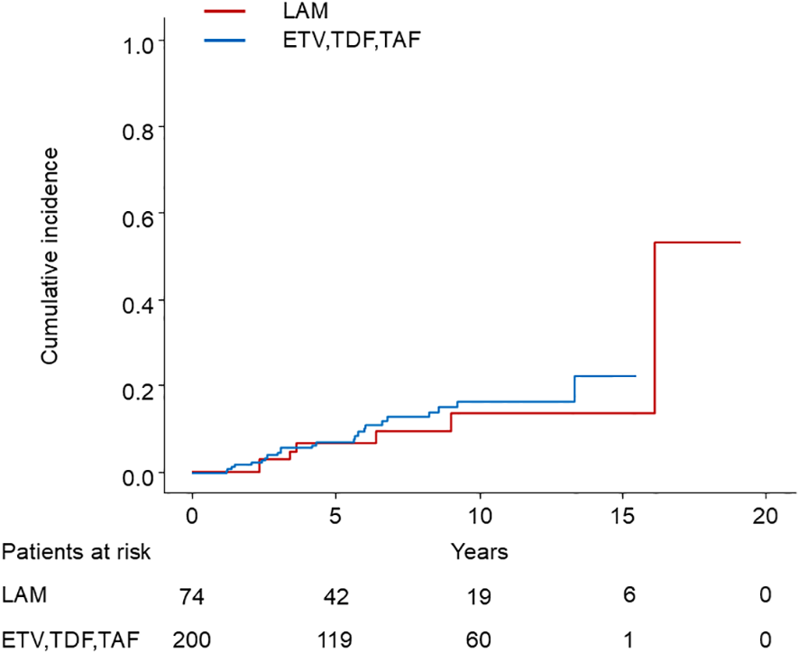 A total of 274 patients received NAs during the study period. The treatment pathways are illustrated in Supplementary Figure S2 as a Sankey diagram, demonstrating the flow of patients between initial and subsequent therapies. Initial treatment consisted of lamivudine (LAM) in 74 patients (27.0%), entecavir (ETV) in 182 patients (66.4%), tenofovir disoproxil fumarate (TDF) in 5 patients (1.8%), and tenofovir alafenamide (TAF) in 13 patients (4.7%). Among LAM-initiated patients, 25 patients (33.8%) transitioned to LAM+ Adefovir (ADV) combination therapy, 25 (33.8%) switched to ETV monotherapy, 5 (6.8%) changed to TAF, and 19 (25.7%) had unassessable subsequent treatment. Viral breakthrough was observed in 31 LAM patients, and primary non-response in 1 patient. For ETV-initiated patients, 179 patients (98.4%) continued ETV therapy. Two patients (1.1%) switched to TAF, and 1 patient (0.5%) had an unassessable treatment course. Viral breakthrough was observed in 3 ETV patients. All TDF-initiated patients (n=5) transitioned to TAF therapy during the follow-up period. All TAF-initiated patients (n=13) continued TAF therapy without requiring treatment modification. No viral breakthrough was observed in either TDF or TAF groups. In total, 271 of 274 NA-treated patients (98.9%) achieved sustained virological response by the end of the observation period.