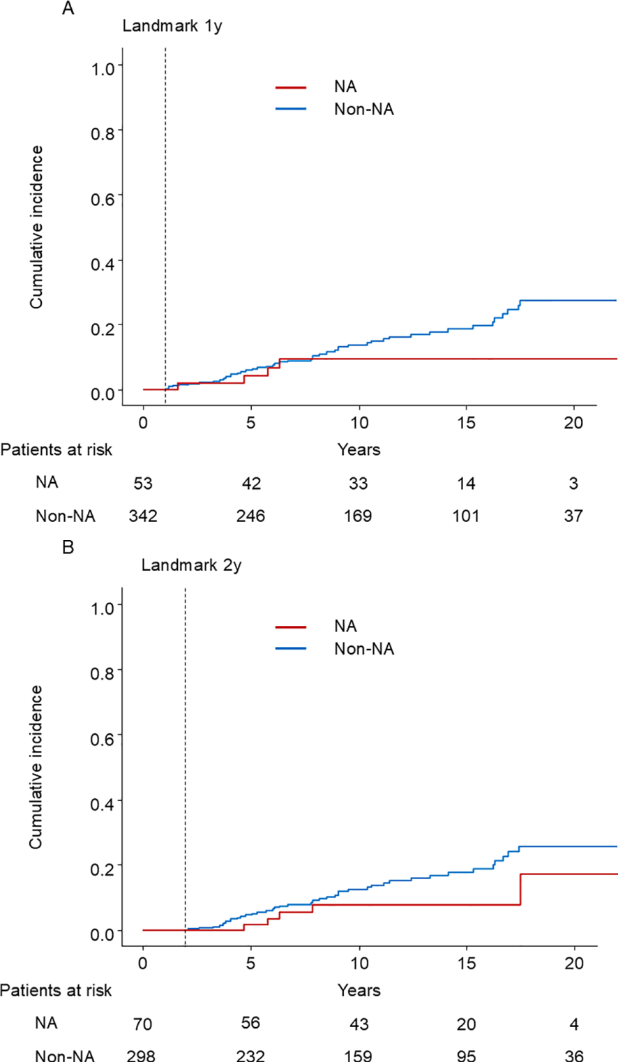 We also performed 1-year and 2-year landmark analyses in the PSM cohort to mitigate the immortal time bias, where patients were stratified according to NA use prior to the corresponding time points.