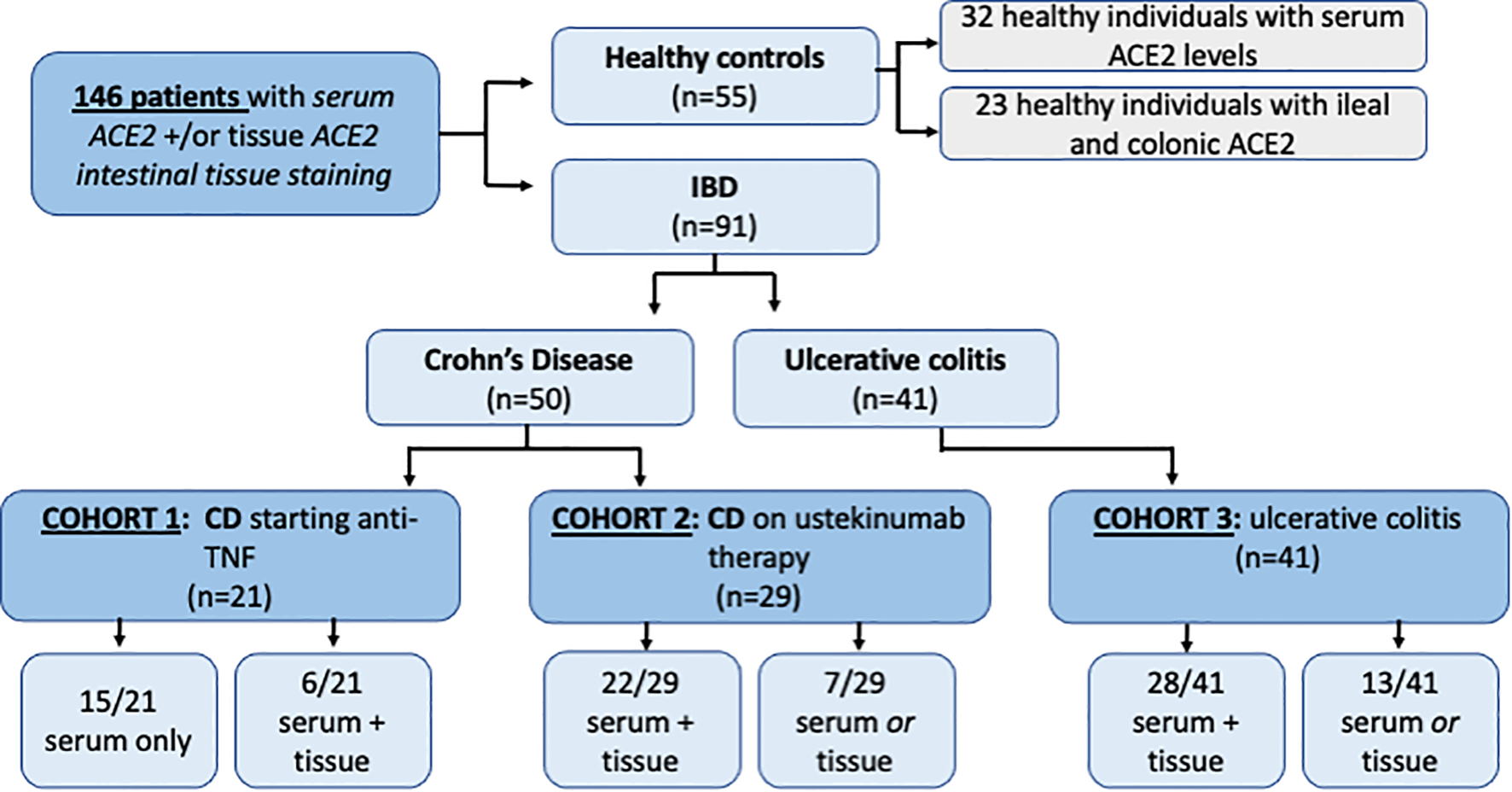 The demographic and clinical characteristics of patients with IBD are presented in Table 1. A flow diagram summarizing the patients included is represented in Figure 2. A total of 146 subjects were included in the analysis. Of the 91 patients with IBD, 56 had contemporaneous serum and tissue samples for ACE2 analysis. Median age did not differ significantly between IBD (CD 36.5, IQR 27.5-48.5; UC 40.6, IQR 33.6-55.8) and control groups (34.0 IQR 27-48, p=0.218). There were significant differences in gender across groups with a higher proportion of female patients in the CD cohort and a higher proportion of male patient in the UC cohort (p=0.001), however overall gender balance was similar between IBD and non-IBD groups.