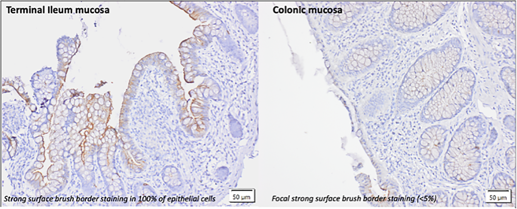 lmmunohistochemical pattern of ACE2 staining in the terminal ileum and colon of healthy controls without evidence of intestinalinflammation. Intestinal tissue biopsies (terminal ileum and colon) were stained with anti ACE2 Ab (1:100). The predominant form of staining (brush border)is demonstrated.
