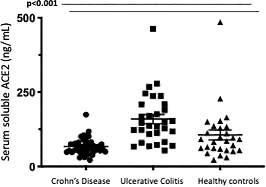 Differences between serum soluble ACE2 in IBD patients compared to healthy controls (human serum samples)