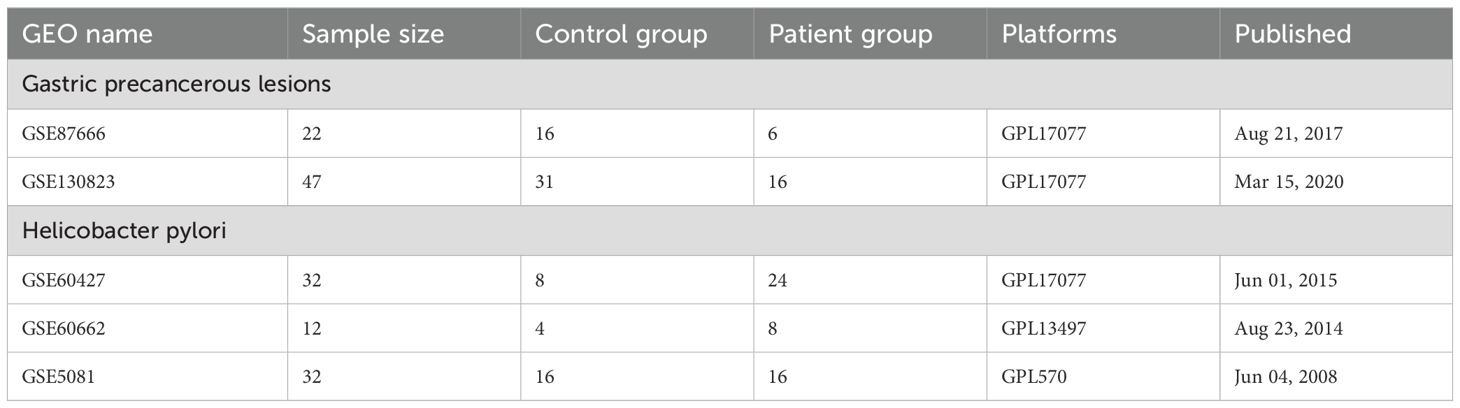 The datasets of GPL and H. pylori were obtained from the GEO (http://www.ncbi.nlm.nih.gov/geo/) database using the keywords “gastric precancerous lesions” and “Helicobacter pylori,” respectively. The datasets GSE87666 and GSE60427 were selected based on the criteria of species ‘Homo sapiens’ and a sample size greater than 10. Dataset GSE87666 included data from 16 patients with GPL and 6 patients with early gastric cancer (EGC), while GSE60427 included data from 8 H. pylori-negative and 24 H. pylori-positive patients. Additionally, the GPL dataset GSE130823 and the H. pylori datasets GSE60662 and GSE5081 were selected to validate the hub genes.