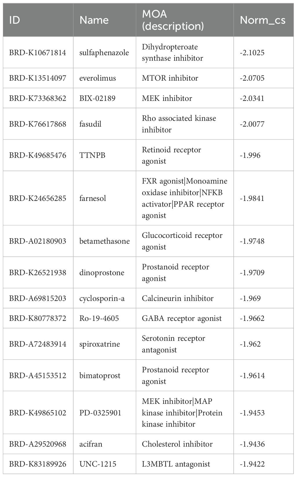 The CMap database is designed to elucidate the relationships between gene expression and drug action, identifying potential treatments and clarifying drug mechanisms. Disease co-DEGs are imported into the CMap database to conduct correlation analyses between drug expression profiles and disease expression profiles. The entries classified as trt_cp underwent screening, and the 15 compounds demonstrating the most significant negative correlation were recognized as potential therapeutic agents based on the norm_cs correlation score.