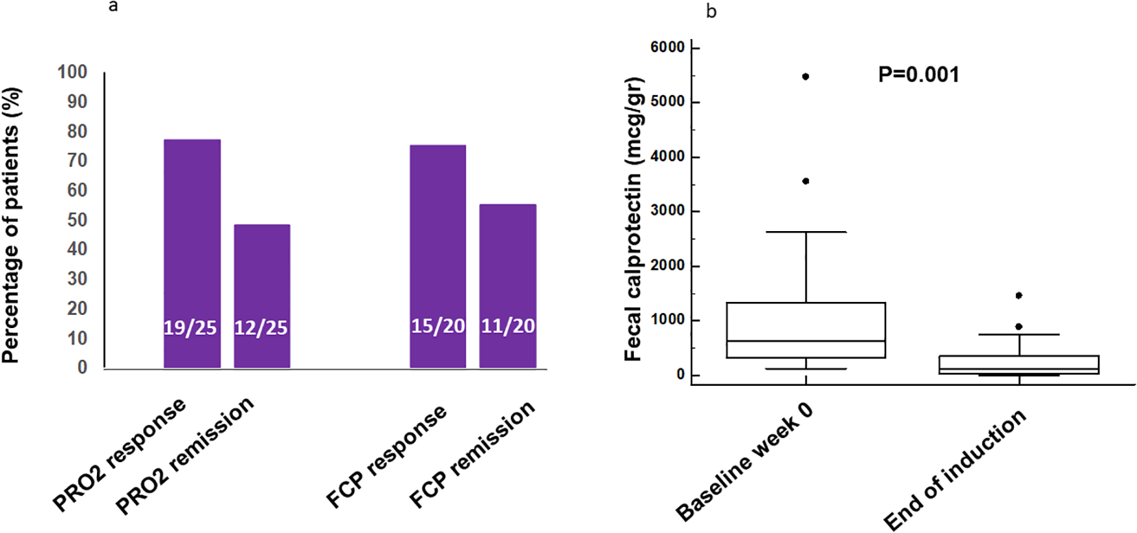 (a) Rates of end-of-induction clinical two-item patient-reported outcome (PRO2) remission and response in the efficacy dataset (n = 25) and of calprotectin remission and response in the efficacy dataset in patients with baseline calprotectin >250 μg/g (n = 20). (b) Median calprotectin levels in stool at baseline and at the end of induction. FCP, fecal calprotectin.