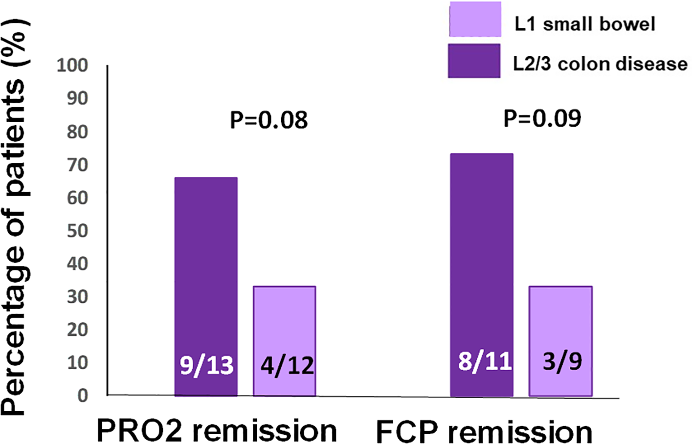 Rates of the two-item patient-reported outcome (PRO2) remission and biomarker calprotectin remission at the end of induction in patients with L1 small bowel Crohn’s disease (CD) versus those with disease involving the colon (L2 or L3).