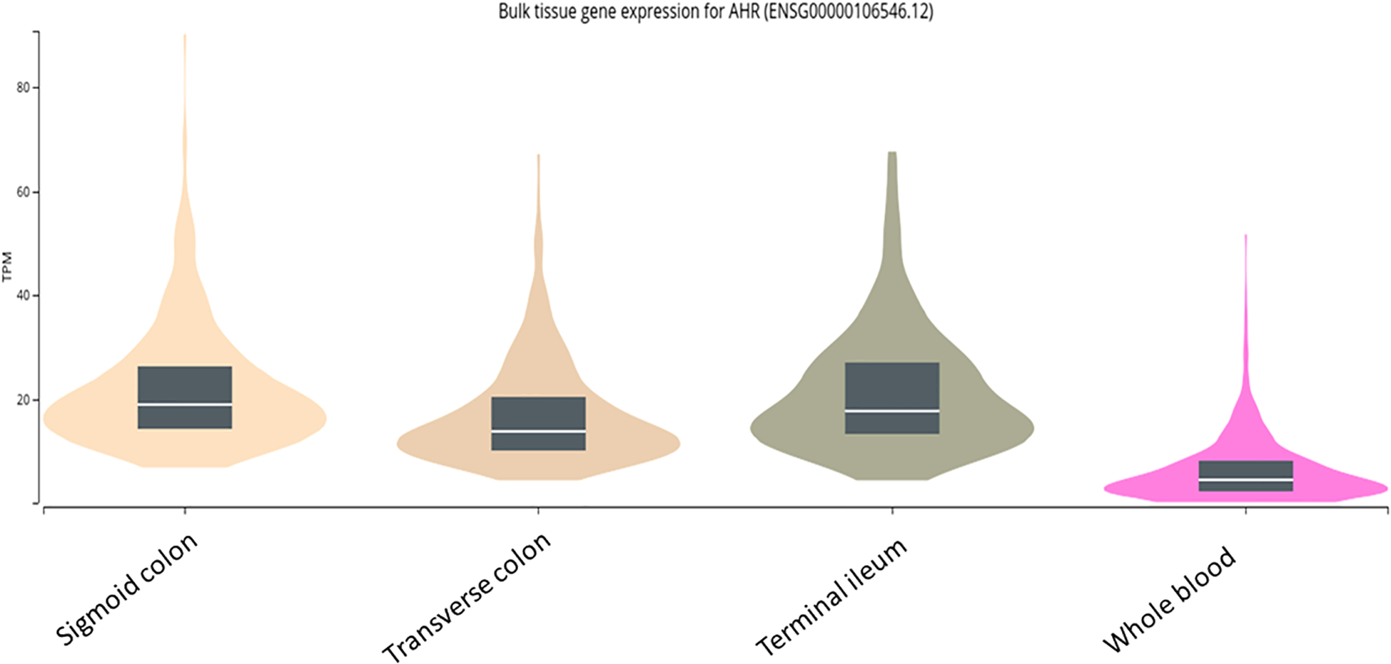 mRNA expression of aryl hydrocarbon receptor (AhR) in the human mucosa of the terminal ileum versus two colonic segments and versus whole blood as extracted from the public domain Genotype–Tissue Expression (GTEx) dataset.