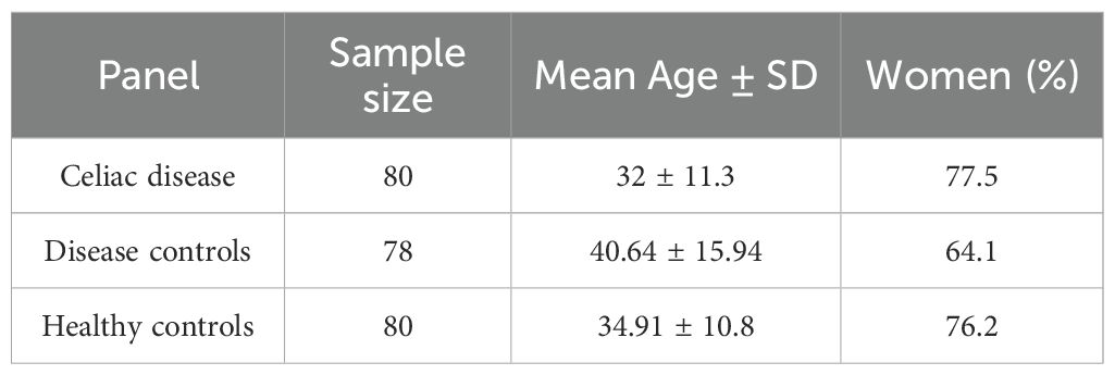 We investigated a panel consisting of 80 celiac disease cases, 78 disease controls and 80 healthy controls. The study was planned to estimate sensitivity and specificity with a 95% confidence interval half-width ≤5%. For the true proportion in the 0.9–1.0 range, n≈80 yields an expected half-width of ≤5% using exact binominal methods; control totals provide comparable precision.