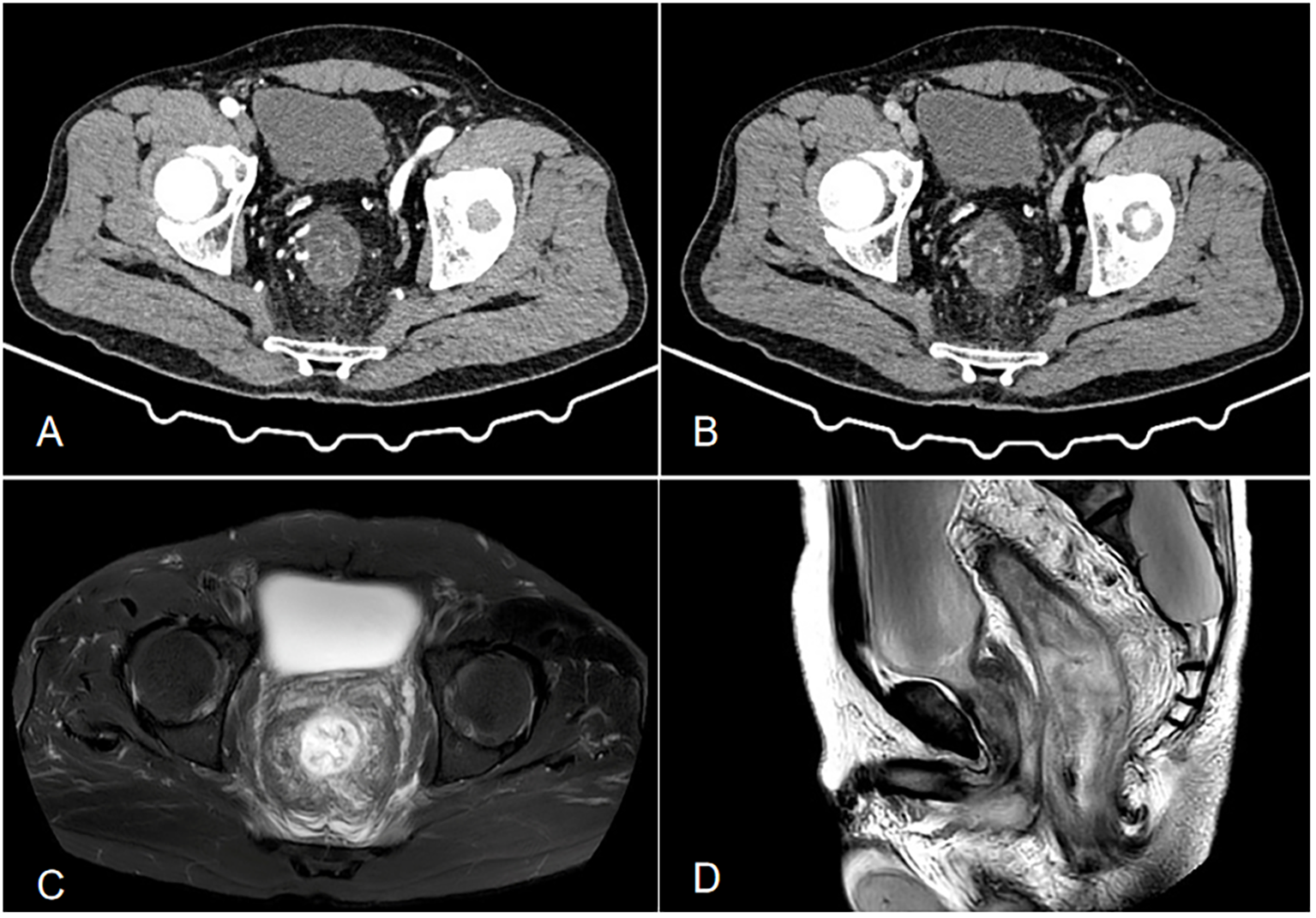 Figure 1. (A, B) Contrast-enhanced CT shows local wall thickening and heterogeneous enhancement of the sigmoid colon, with increased and thickened surrounding blood vessels, dilation and effusion of the proximal intestinal lumen, thickening of the distal rectosigmoid colon wall showing a layered change, and layered enhancement after enhancement. Its feeding artery is thickened, with exudation and fascia thickening seen around(a is the venous phase, and b is the arterial phase). (C, D) Enhanced pelvic MRI demonstrated segmental wall thickening of the rectum and sigmoid colon with marked blurring in the perirectal fat plane. (c is T2-weighted fat-suppressed sequence, and is Sagittal T2WI sequence).