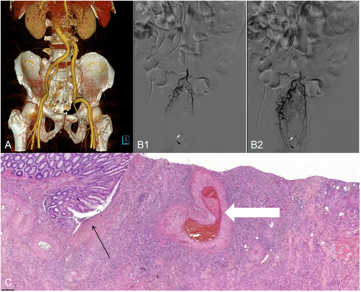 Figure 3. (A) Three-dimensional reconstructed CT shows a thickened, tortuous vessel shadow accompanying the superior rectal artery in the arterial phase, with enhancement degree consistent with that of the surrounding veins in the venous phase. (B1, B2), Angiogram demonstrating a superior rectal artery AVF with early venous shunting. (C) Histopathological examination (H&E staining, magnification×10) shows intestinal mucosal erosion and necrosis (black arrows), along with vascular wall thickening and thrombosis (white arrows).