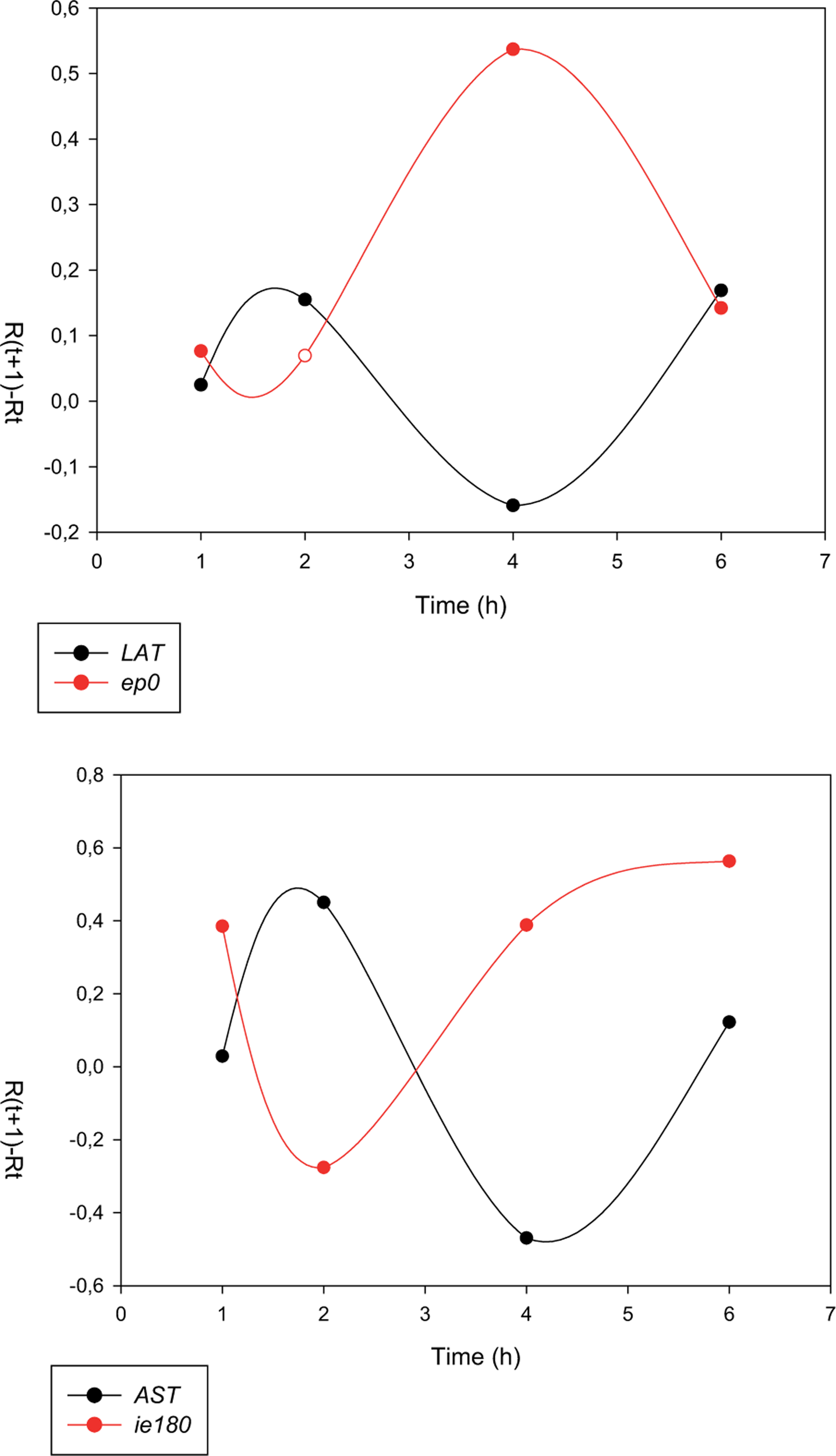 Inverse expression pattern between the sense and antisense transcripts of pseudorabies virus. The transcription rates (RΔ values) of sense (mRNAs) and antisense RNAs exhibit reciprocal relationships [67]. That is, high transcriptional activity of mRNAs results in a decrease in the transcription rate of the antisense transcripts, and vice versa.