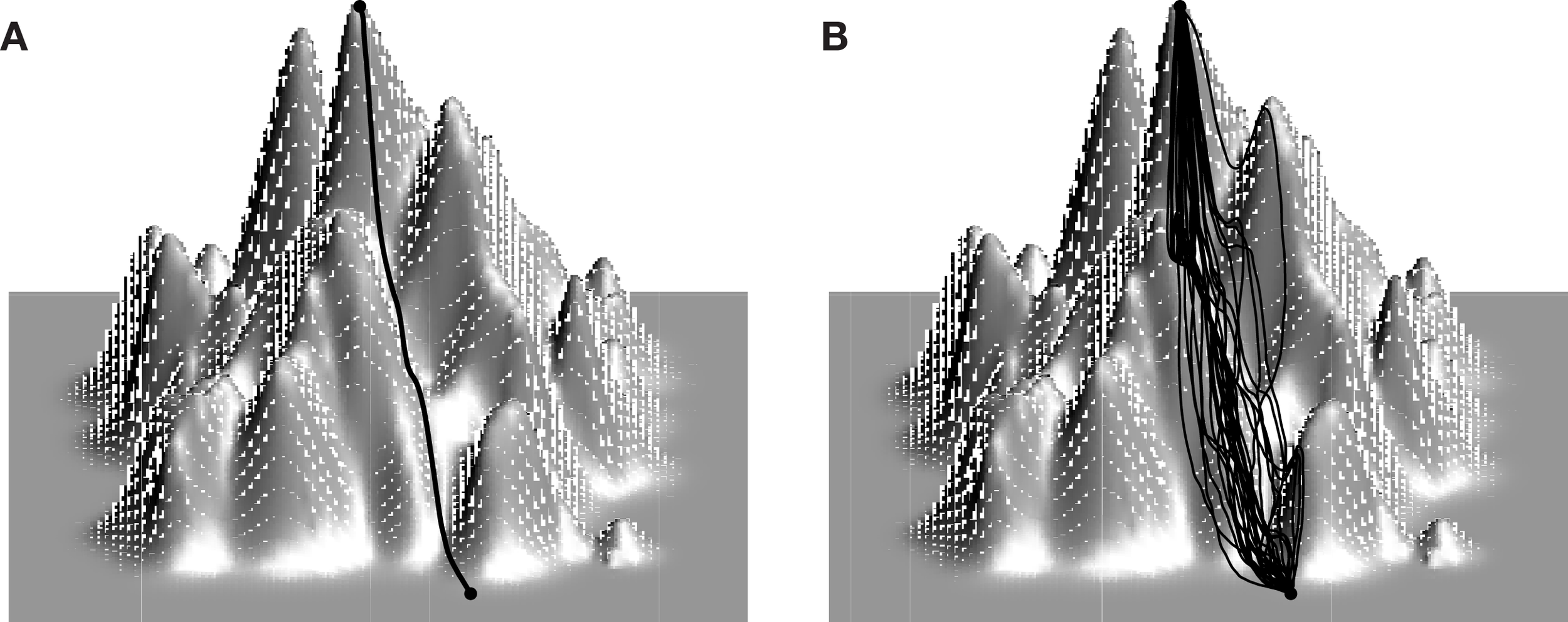 Figure 1. Mutation rate and evolutionary trajectories on fitness landscapes. When mutations are rare (A), the population is nearly homogeneous and mutations are fixed sequentially via sweeps. Evolution can therefore be represented by a single path on the fitness landscape. Several distinct clones coexist at any given time in the population when mutation rate is high. (B) If each clone is allotted its own trajectory, the evolution of the population can be represented by a bundle of trajectories which split and terminate on the way to the summit. At any given time the population can be represented by a probability density function in sequence space.
