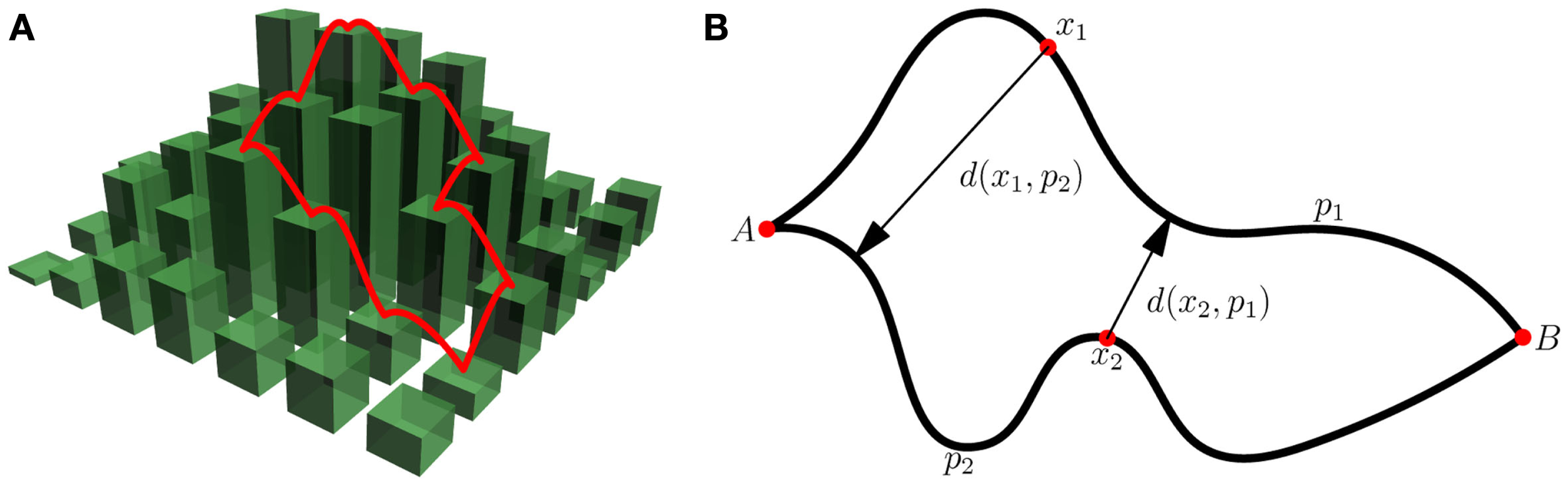Figure 2. Divergence of evolutionary paths on fitness landscapes. (A) Demonstrates monotonic paths on a fitness landscape. Each path’s probability of occurrence in the SSWM limit is the inverse product of the number of “up” steps at each point along the path. The ensemble path divergence of the “ensemble” consisting of only these two paths would be the product of their probabilities of occurrence and the inter-path distance. (B) Illustrates the calculation of the inter-path distance d(p1, p2). For every point x1 ∈ p1 we find the closest point on p2 and record the distance d(x1, p2). We perform the same operation for points on p2. The distance is then d(p1, p2) = (∑p1 d(x1, p2) + ∑p2 d(x2, p1))/(length(p1) + length(p2)).