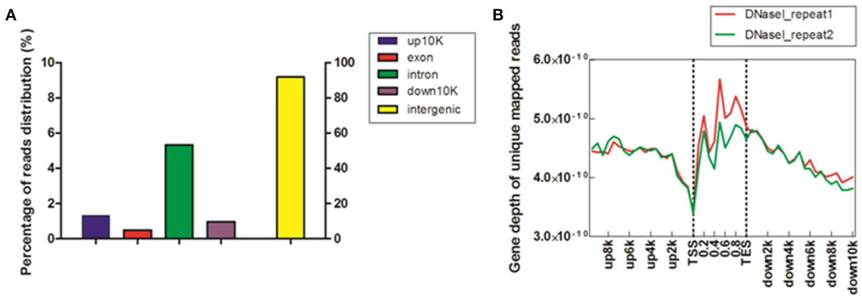 From the Figure 1A, we can see that most DHSs reads were allocated to intergenic and intronic regions, however, the percentages of these regions were also greater than others in the whole genome. Therefore, we normalized the DHSs reads distribution to DHSs abundance based on the percentage value of various functional regions (Figure S1). Similarly, reads abundance in intergenic region was still the highest (1.29), followed by exonic region (0.40) and intronic region (0.36), which suggested an orderly preference of DNase I for those genomic sections. Several studies showed that various macrophage-specific DHSs were identified within mouse intron 2. The sequences of those DHSs are highly conserved and some of them can be denoted as intron regulatory elements, such as FIRE, acting as a macrophage-specific enhancer in the fms gene expression (Himes et al., 2001). Additionally, it has been reported that 95% of DHSs were observed in intronic and intergenic regions based on 125 different human cell types (Thurman et al., 2012). Therefore, DHSs located in introns and intergenic regions would like to be expected to the vital and conserved regulatory elements without influencing by cell-type and tissue-type specific.
