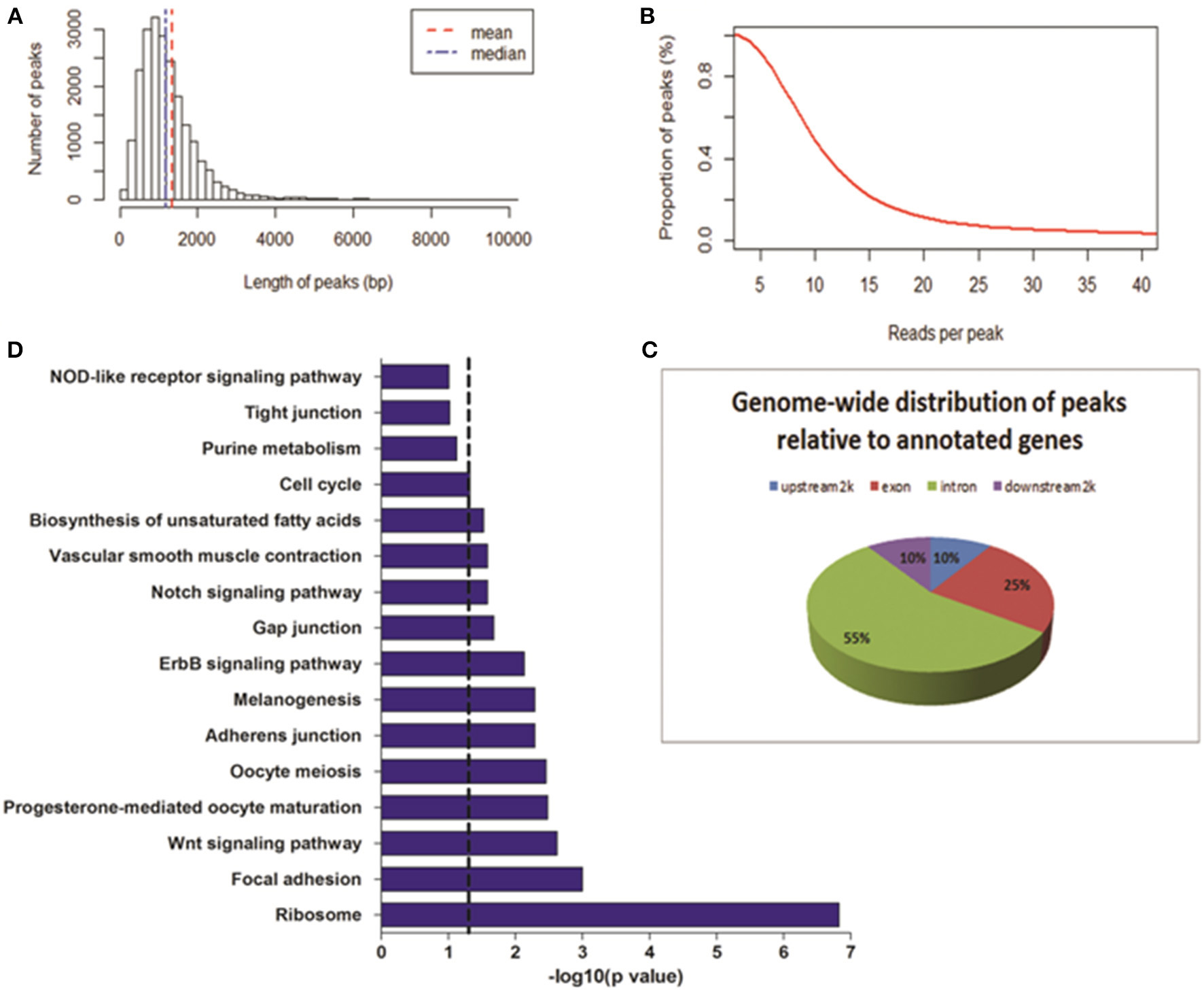 Genome-wide distribution of DNase-seq peaks. (A) Length of peaks. X-axis represents the length of peak; Y-axis represents the number of peaks. (B) Proportion of peaks with reads number. Coverage of reads in peak regions was calculated. The reads number of each peak and peak numbers were added with the cumulative density statistics. (C) The locations of DHSs relative to annotated genes. Genome-wide distributions of DHS peaks in annotated gene regions were shown. DHS peaks were counted in upstream 2 Kb, exon, intron, and downstream 2 Kb regions. (D) Pathways analysis of genes related to DHS peaks. Dashed line: threshold line corresponds to P-value of 0.05.