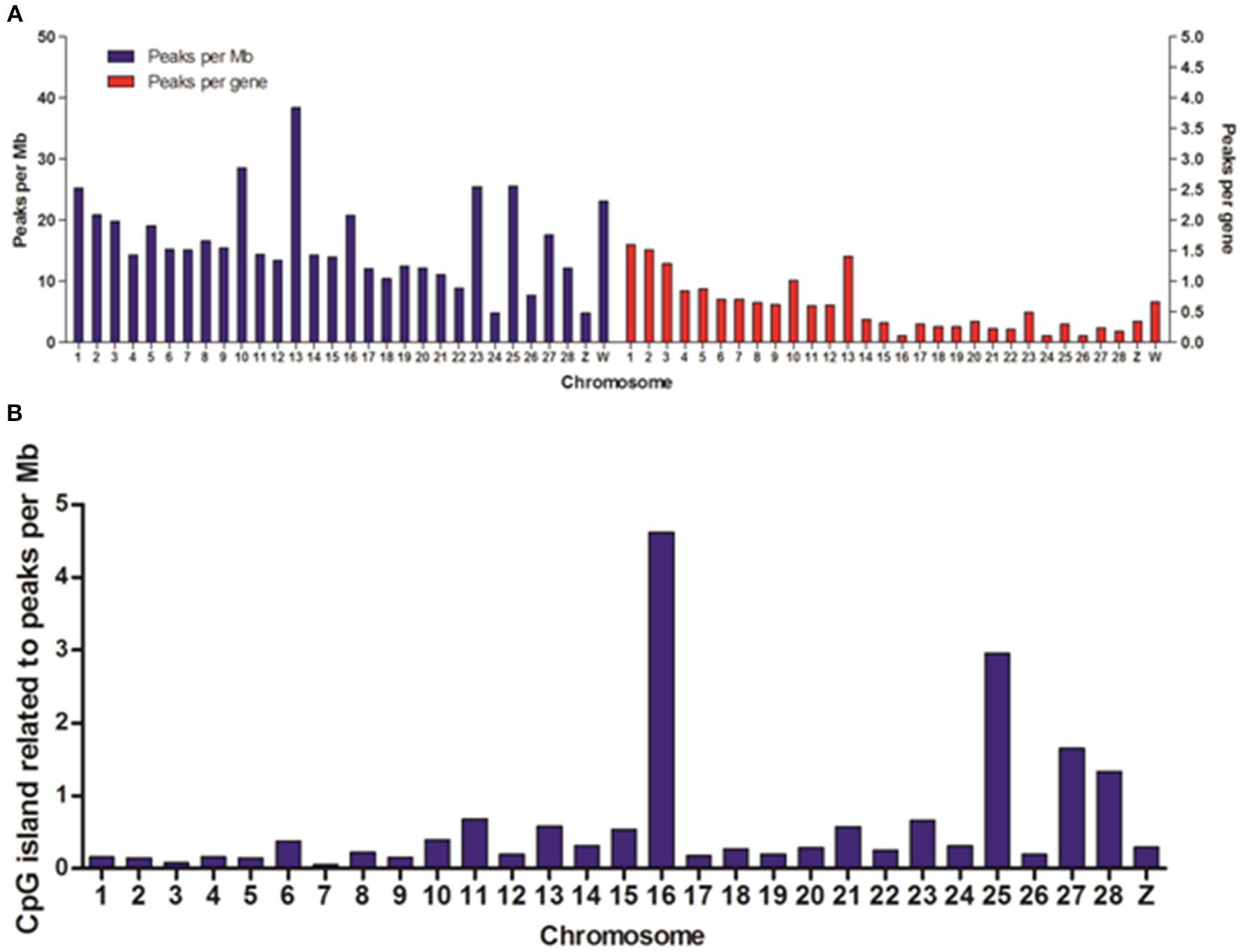DNA methylation is one of the most prevalent mechanisms to maintain inactive genomic regions in a repressed state, and it is also one of the most stable modifications (Bird, 2002). In order to study the relationship between DNA methylation and DNase I hypersensitive sites, we overlapped DHSs peaks with CpG islands and normalized per Mb in chromosomes except for all random chromosomes. The results showed chromosomes 1, 2, 3, 10, 13, 23, and W highly enriched DHSs peaks per gene appeared to low density of CpG islands (Figure 3B), conversely, there was significant high density CpG islands on chromosome 16 when DHSs peaks density per gene was very low on this chromosome, which suggested that DNase I sensitive domain preferred to act within active chromatin domains that present low density CpG islands (Cockerill, 2011).