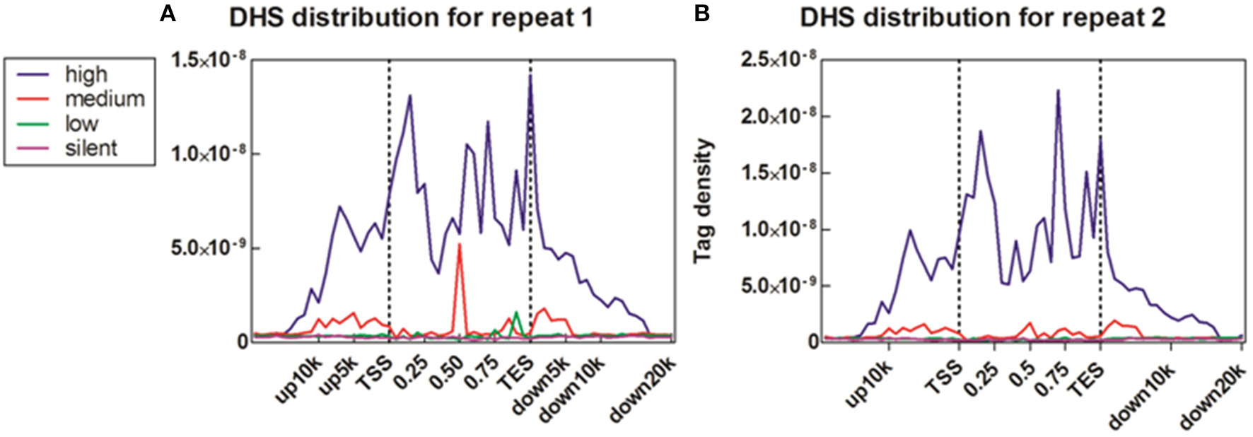 To study the correlation of DNase I hypersensitive sites with gene expressions, transcriptional levels of genes in chicken MSB1 cells were obtained by RNA-seq analysis. Then, these genes (17,934 genes) were broken up into 170 sets of 100 genes by ranking their expression levels. Four out of the 170 sets shown in Figure 4 correspond to highly expressed, two degrees of intermediately expressed (medium and low) and silent genes respectively. Tags detected were aligned in each gene set across transcription start sites (TSS) or gene bodies. To calculate the DHSs profiles across the gene bodies, the tag numbers detected in every 5% of the gene-body region and every 1 kb outside of the gene-body region were summed and normalized in the four expressed sets. For DHSs analysis near TSS (Figure 5), the tag density (number of tags per base pair) was calculated in the top 1000 high expressed and 1000 low expressed genes relative to the upstream 100 Kb of TSS.