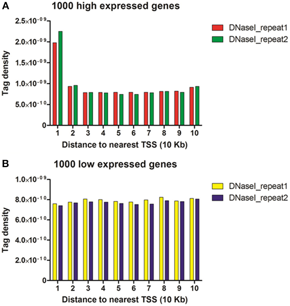 DHSs reads were enriched near genes that were expressed in the MSB1 cells. (A) DHSs density levels in upstream 100 Kb regions relative to TSS for 1000 high expressed genes. (B) DHSs density levels in upstream 100 Kb regions for 1000 low expressed genes.