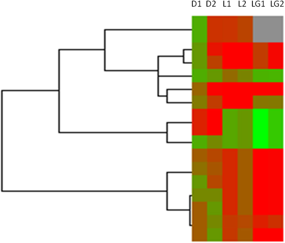 Heatmap of DHSs, overlapped lincRNAs and neighboring genes of lincRNAs in MSB1 cell line. Based on RNA-seq data in MSB1 cell line, 124 candidate lincRNAs were identified and only 17 lincRNAs are overlapped with DNase I hypersensitive sites (DHSs). Normalized intensity values of DHSs (rows) and expressions values of their overlapped lincRNAs and neighboring genes of lincRNAs were ordered using Centroid Spearman Rank Correlation and hierarchical clustering in Cluster3.0 software. The intensity of DHS was represented by reads number in this peak of DNase I hypersensitive site. The expression of lincRNA and its neighboring genes were represented by FPKM (Fragments Per Kilobase of transcript per Million mapped reads). The dendrogram showed the similarity (distance) of DHSs intensity, lincRNAs and neighboring genes expressions and was divided into sub-trees as distinguished from different colors. Arrays (columns) were grouped that D1 stands for the intensity of DHSs in duplicate 1, D2 stands for the intensity of DHSs in duplicate 2, L1 stands for expressions of lincRNAs overlapped DHSs in duplicate 1 and L2 stands for expressions of lincRNAs overlapped DHSs in duplicate 2; LG1 and LG2 are expressions of neighboring genes of lincRNAs in duplicate 1 and duplicate 2, respectively. Red and green colors reflect the high and low intensities, respectively.