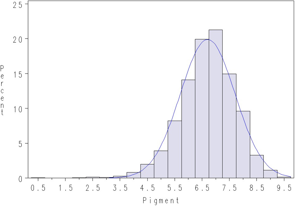 FC was recorded in a subsequent slaughter test in April 2013, where fish originating from both lice challenge tests were jointly recorded for FC (majority of the recorded fish originated from Test 1). The trait FC was defined as the pigmentation (redness) of the fillet and was automatically measured using image analysis with PhotoFish equipment and software (Photofish AS, Ås, Norway). The recorded FC was found to be approximately normally distributed (Figure 3).