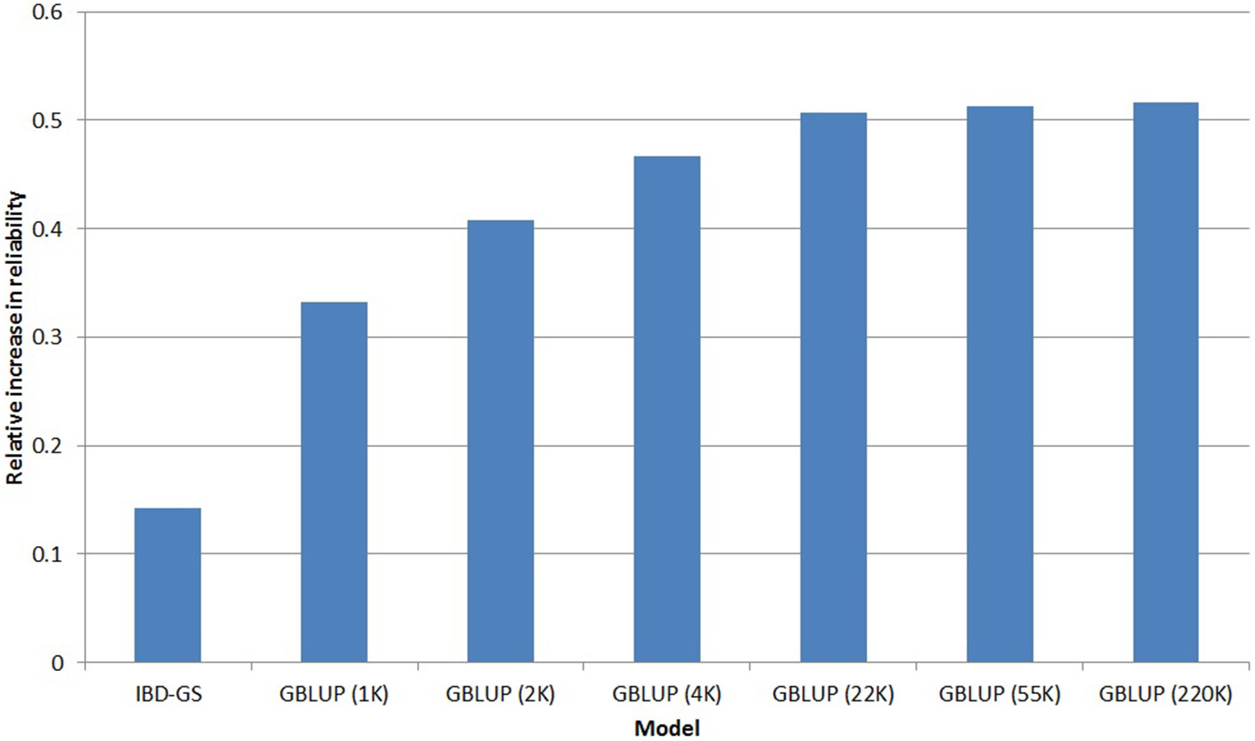 Relative increase in reliability1 of genomic selection models for LR compared with a classical pedigree-based model.