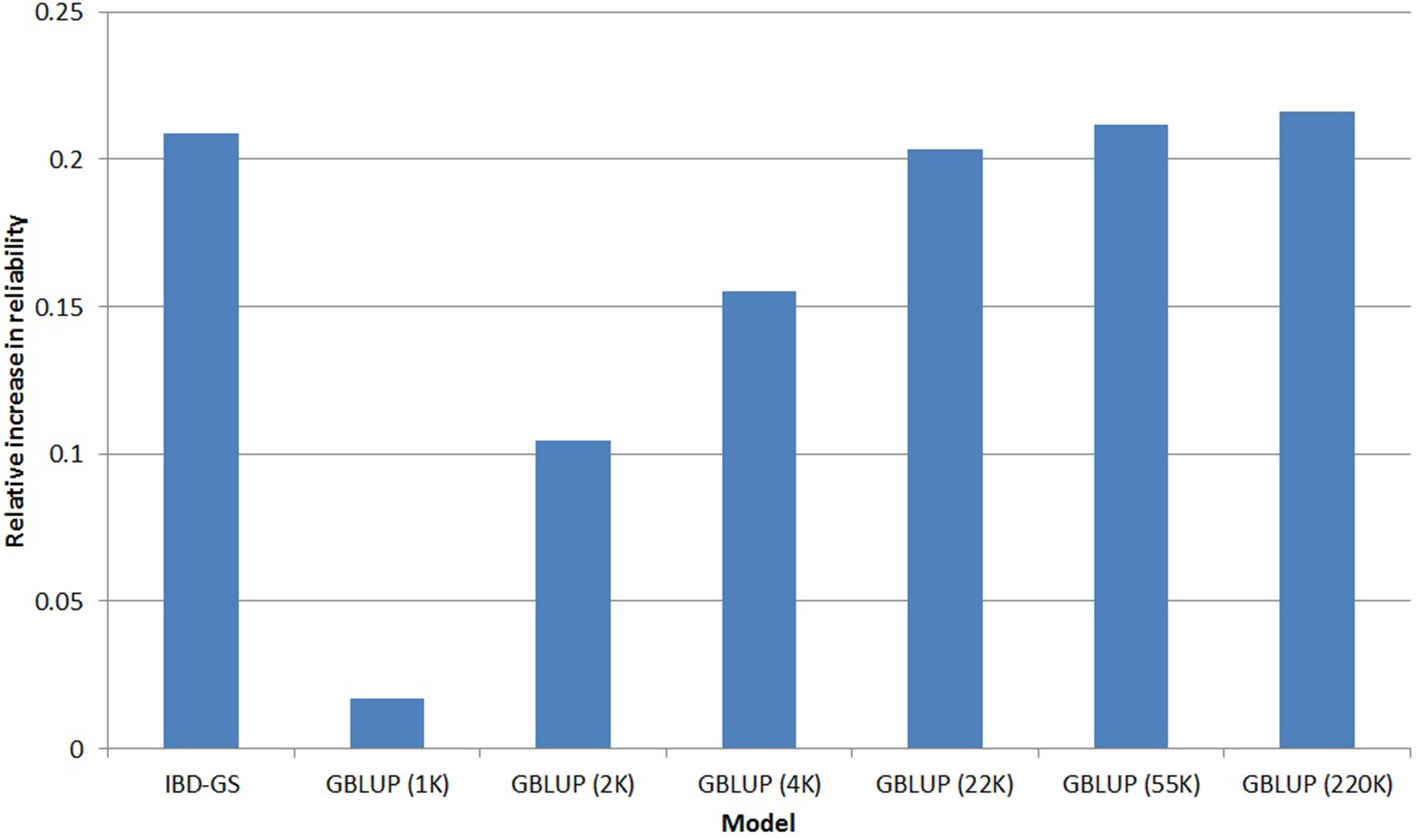 Relative increase in reliability2 of genomic selection models for FC compared with a classical pedigree-based model.