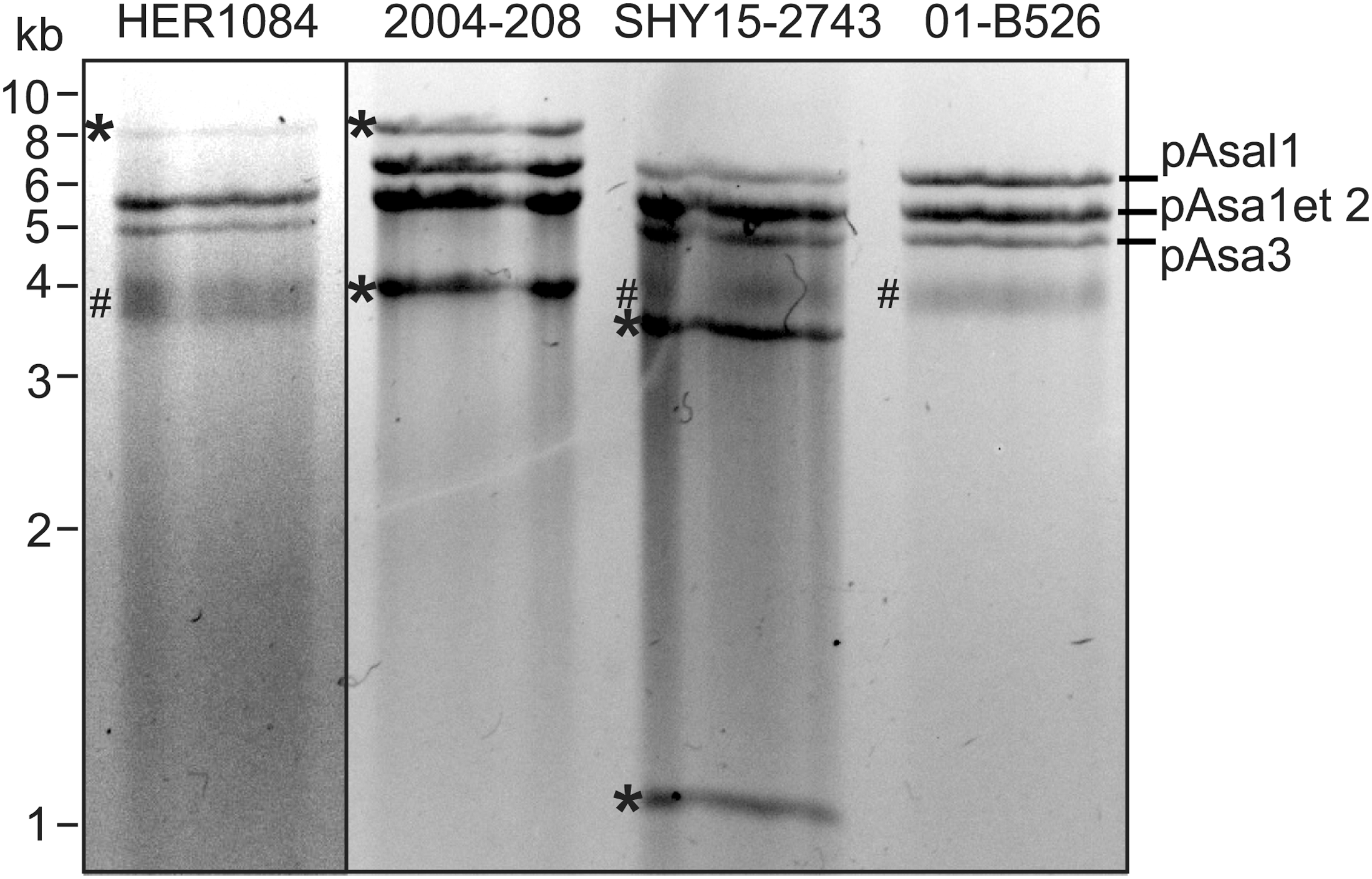 Atypical small plasmid profiles of strains HER1084, 2004-208 and SHY15-2743. A small plasmid extraction of each strain was digested with EcoRI prior to agarose gel electrophoresis. Each strain bears one or two additional bands (marked with ). Strain 01-B526 harbors a typical plasmid profile composed of the non-cryptic pAsal1 plasmid, and pAsa1, pAsa2, and pAsa3 plasmids with unknown functions. Incompletely digested plasmidic DNA was also present (#).