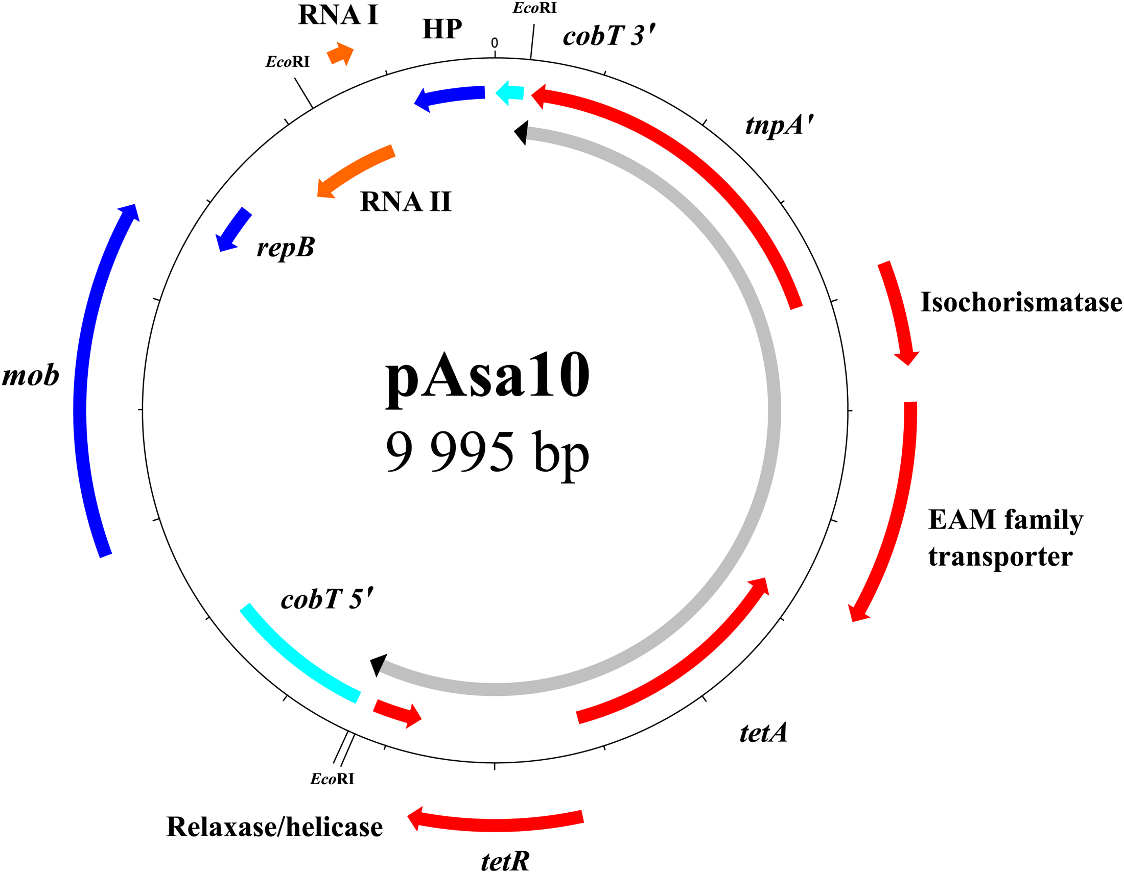 Map of the pAsa10 plasmid found in strain SHY15-2743. The tetracycline resistance is borne by the tet region of transposon Tn1721. Tn1721 interrupts gene cobT involved in the biosynthesis of cobalamin. The genes of the mobile genetic element are shown in red, the pseudogene in turquoise, the genes of the backbone in blue, and the RNAs in orange. The portion of the plasmid comprising the transposon is shown in gray with the inverted repeats in black.