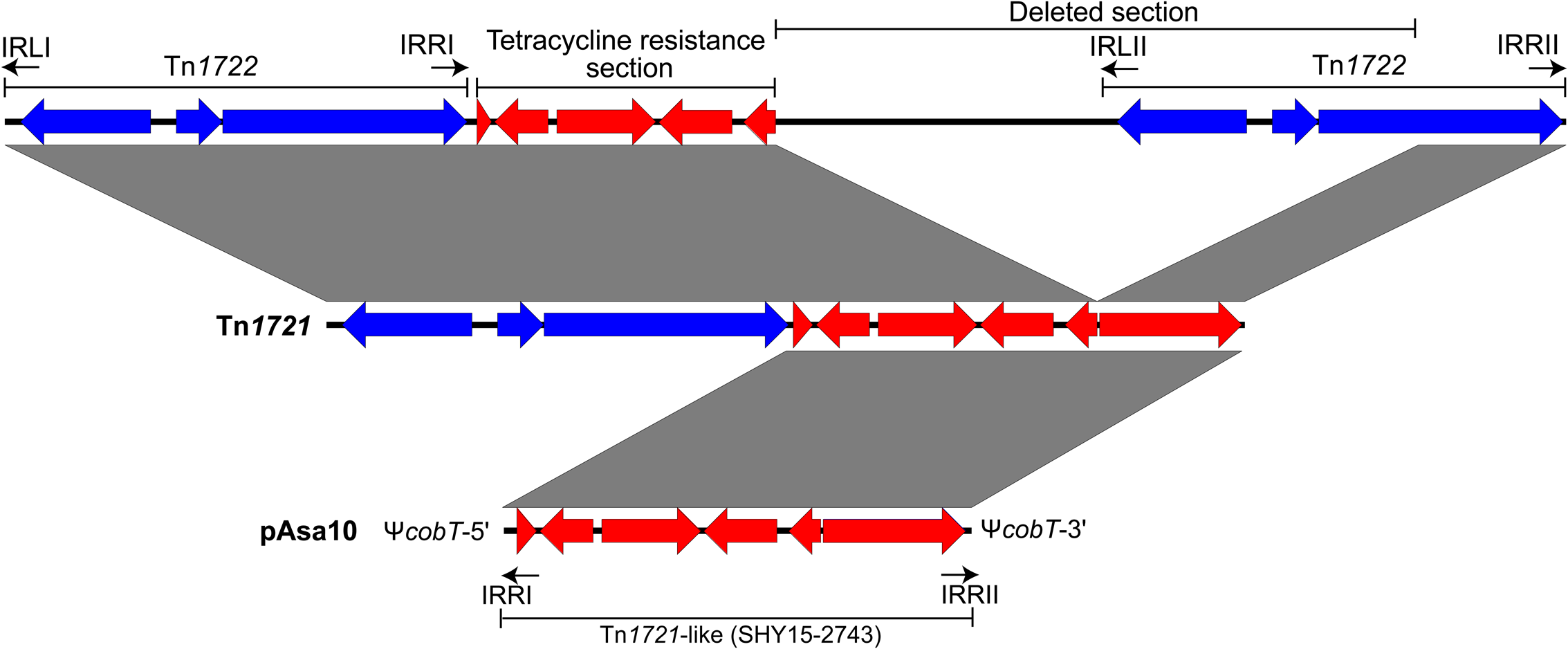 Formation of transposon Tn1721 and atypical orientation of its IRs in the pAsa10 plasmid. The formation of Tn1721 is the result of a partial deletion of transposon Tn1722, localized near another Tn1722, itself next to genes responsible for tetracycline resistance (Schmitt et al., 1981). The tet region is in red and the complete transposon Tn1722 in blue.