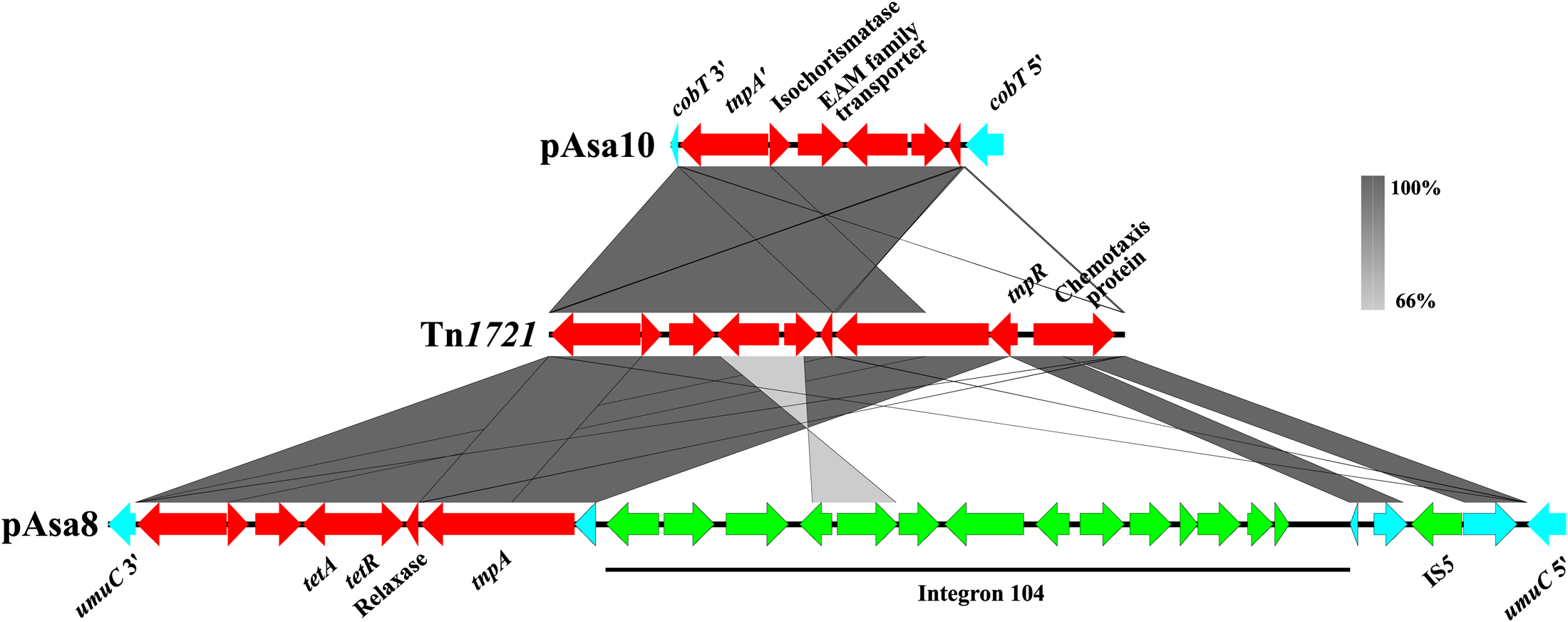 Comparison of the known and sequenced Tn1721 in plasmids of A. salmonicida subsp. salmonicida. The gray zones represent similarities between pAsa10, Tn1721 and pAsa8 (accession numbers MF621616, X61367 and KX364409, respectively). The genes of Tn1721 are shown in red, the pseudogene in turquoise, and the other mobile genetic elements in green.