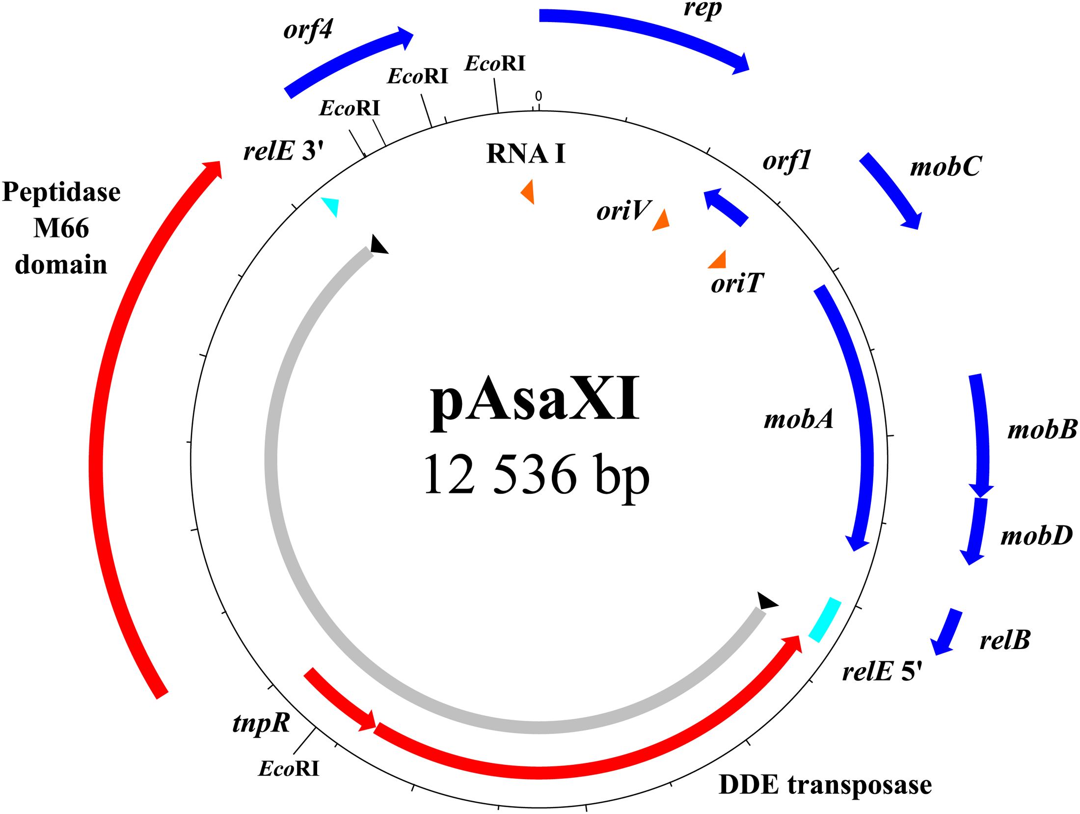 Map of the pAsaXI plasmid. The genes of the mobile genetic element are shown in red, the pseudogene in turquoise, the genes of the backbone in blue, and the RNA with the oriT and oriV in orange. The portion of the plasmid comprising the transposon is shown in gray with the inverted repeats in black.
