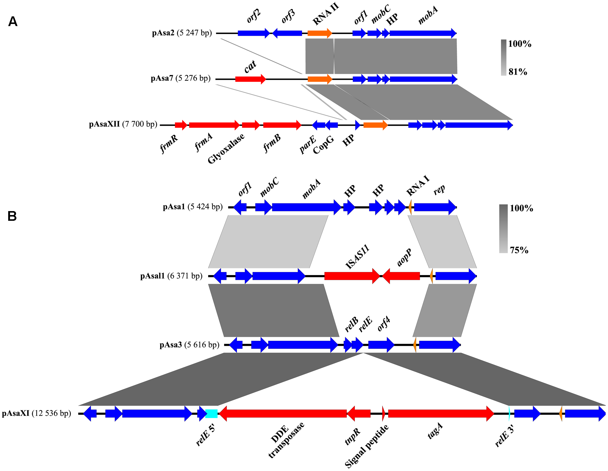 Nevertheless, the pAsaXI and pAsaXII plasmids described in this study present new clues about the potential functions of cryptic plasmids, and for pAsa2, about orf2 and orf3. Since these new plasmids share backbones with pAsa3 and pAsa2 respectively, we compared them with the “original” cryptic plasmids and their variants (Figure 7). For the ColE1-type replicon plasmids (pAsa2 and its variants pAsa7 and pAsaXII) the region including orf2 and orf3 is lost in the derivatives of pAsa2. Indeed, this lost part has been replaced by a DNA segment including the gene cat for pAsa7 (Vincent et al., 2016), and by the putative MIC bearing the detoxification system for formaldehyde in pAsaXII. This observation suggests that orf2 and orf3 are non-essential for pAsa7 and pAsaXII plasmids, and/or that the proteins produced by these ORFs are brought in trans by plasmid pAsa2, since it is present in the strains that bear pAsa7 and pAsaXII.