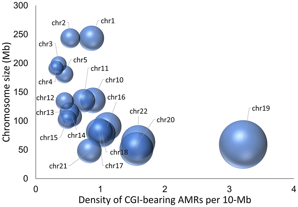 Three-dimensional bubble chart display of the density of novel candidate iDMRs. The diameter of the bubble represents the density of candidate iDMRs per 10 Mb autosomal region, whereas the position of the balloon on the y-axis is related to the chromosomal size in Mb. The highest density of candidate iDMRs is 3.1/Mb on chromosome 19.