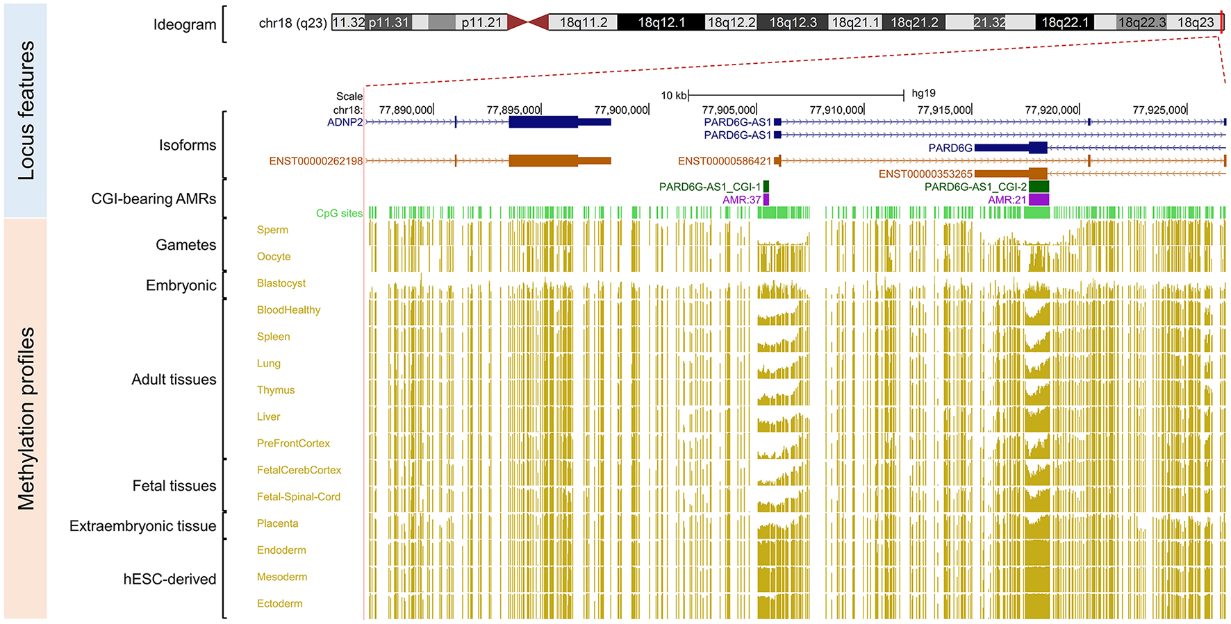Primary intermediate methylation status at the PARD6G-AS1 predicted promoter region. Chromosome 18 ideogram; physical positions and domain features of the PARD6G-AS1 locus depicting the methylation status at the CpG sites (golden ticks) across a 40 kb long-span view (hg19; chr18:77886816–77926815). The methylation levels are represented on a scale from 0 to 1 (hypomethylated to hypermethylated). The image is centered on the CGI localized in the PARD6G-AS1 predicted promoter region, labeled “PARD6G-AS1 CGI-1.” The light green ticks represent the positions of the CpG sites. The methylation level across the PARD6G-AS1 CGI ranges from 0.35 to 0.65 in adult somatic tissues. In the same region, there is asymmetrical methylation in gametes (hypermethylation in oocytes and hypomethylation in spermatozoa). The PARD6G-AS1 gene partly overlaps the downstream PARD6G gene locus, which is transcribed in the opposite direction from the minus DNA strand. The annotated features are (from top to bottom) the exon-intron organization of the principal and alternative PARD6G-AS1 and PARD6G splice isoforms (variants 1 and 2 in shades of dark blue) and the species-conserved PARD6G-AS1 and PARD6G principal isoform transcripts (ENST00000586421 and ENST00000353265, respectively, in brown) (Rodriguez et al., 2013).