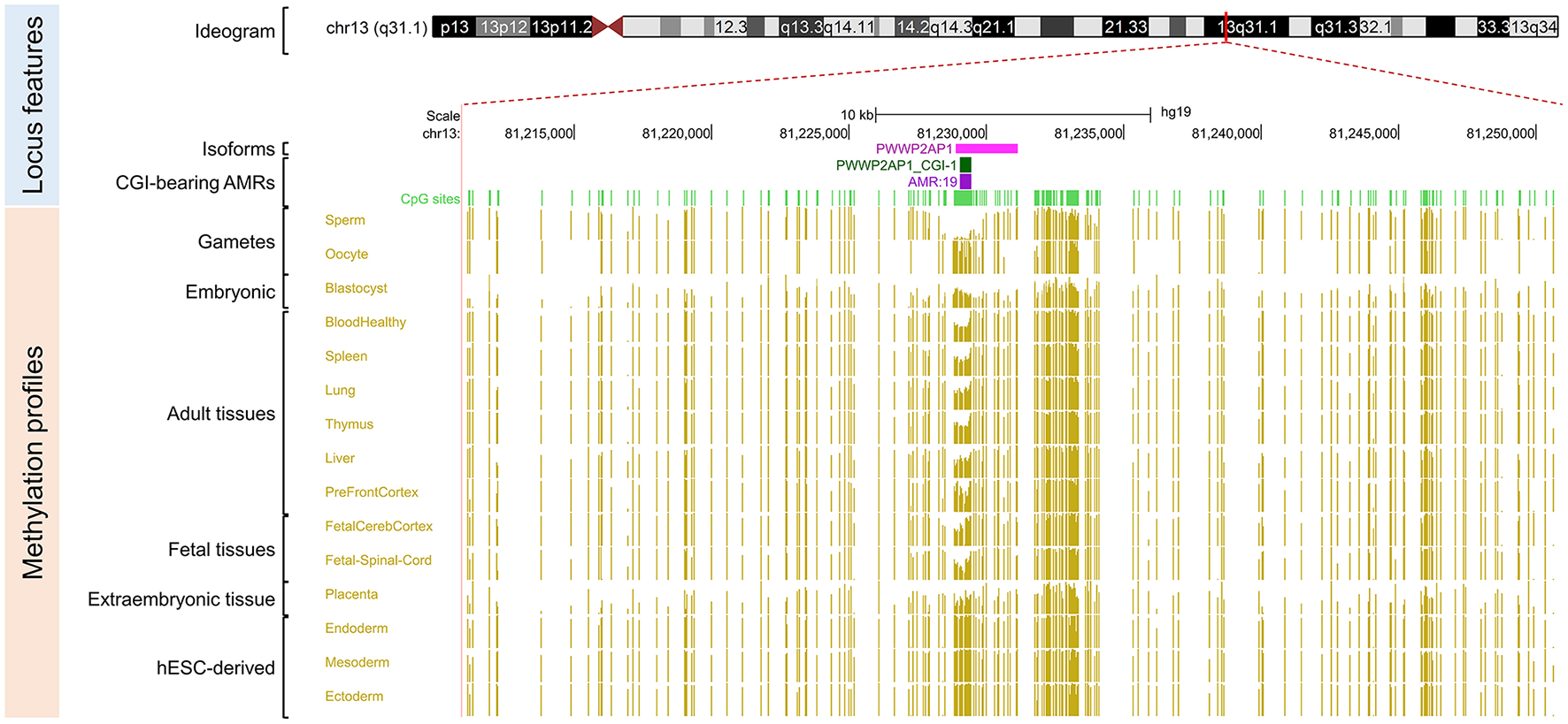 Primary intermediate methylation status at the PWWP2AP1 processed pseudogene. Chromosome 13 ideogram; physical positions and domain features of the PWWP2AP1 locus showing the methylation status at the CpG sites (golden ticks) across a 40 kb long-span view (hg19; chr13:81210960-81250959). The methylation levels are represented on a scale from 0 to 1 (hypomethylated to hypermethylated). The image is centered on the CGI localized in the PWWP2AP1 predicted promoter-flanking region, labeled “PWWP2AP1 CGI-1.” The light green ticks represent the positions of the CpG sites. The methylation across the CpG sites within the PWWP2AP1 candidate iDMR ranges from 0.35 to 0.65 in adult somatic tissues. In the same region, however, there is asymmetrical methylation in gametes (hypermethylation in oocytes and hypomethylation in spermatozoa). The GENCODE ENST00000429776.2 transcript for the PWWP2AP1 locus is shown. The annotated features (from top to bottom) are as in Figure 2.