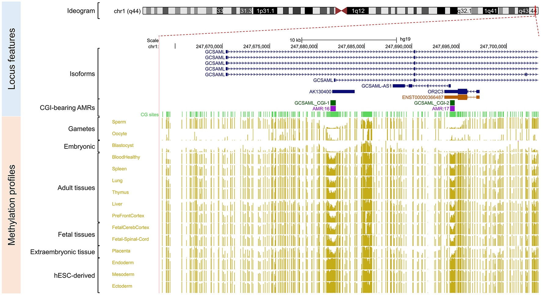Secondary intermediate methylation status at the GCSAML predicted secondary promoter. Chromosome 1 ideogram; physical positions and domain features of the GCSAML locus displaying the methylation status at the CpG sites (golden ticks) across a 40 kb long-span view (hg19; chr1:247663350-247703349). The methylation levels are represented on a scale from 0 to 1 (hypomethylated to hypermethylated). The image is centered on the intronic CGI (GCSAML CGI-1 track) near the GCSAML predicted secondary promoter-flanking region. The light green ticks represent the positions of the CpG sites. The GCSAML locus overlaps two other annotated genes (GCSAML-AS1 and OR2C3). The annotated features (from top to bottom) are as in Figure 2. The methylation level across the CpG sites within the GCSAML candidate iDMR ranges from 0.35 to 0.65 in adult somatic tissues. In methylomes from male and female gametes and from blastocysts, this region is hypomethylated.