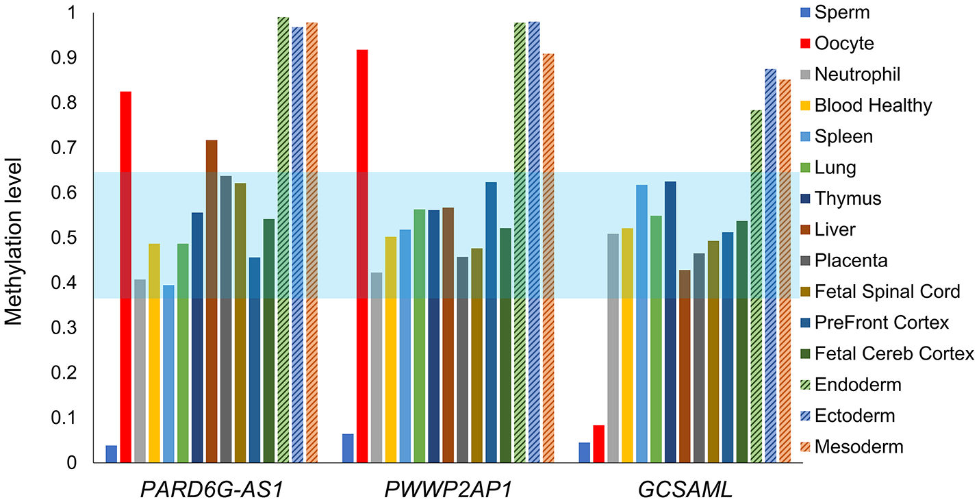Intermediate mean methylation level across the PARD6G-AS1, PWWP2AP1, and GCSAML candidate iDMRs. Comparative variation in the average methylation levels across all 5mCpG sites on the candidate iDMRs in the methylomes of healthy tissues depicted in Figures 2–4. In adult somatic tissues, the overall mean levels were 0.39 (PARD6G-AS1 iDMR), 0.42 (PWWP2AP1 iDMR) and 0.42 (GCSAML iDMR). A slightly skewed hypermethylation state (0.70) was observed in the liver for the PARD6G-AS1 iDMR. The three candidate iDMR regions are consistently hypermethylated in hESC-derived CD56+ ectoderm and mesoderm and hESC-derived CD184+ endoderm cell cultures. The light blue zone represents the expected intermediate methylation range (0.35–0.65). Each methylome is represented by a different color of bar.
