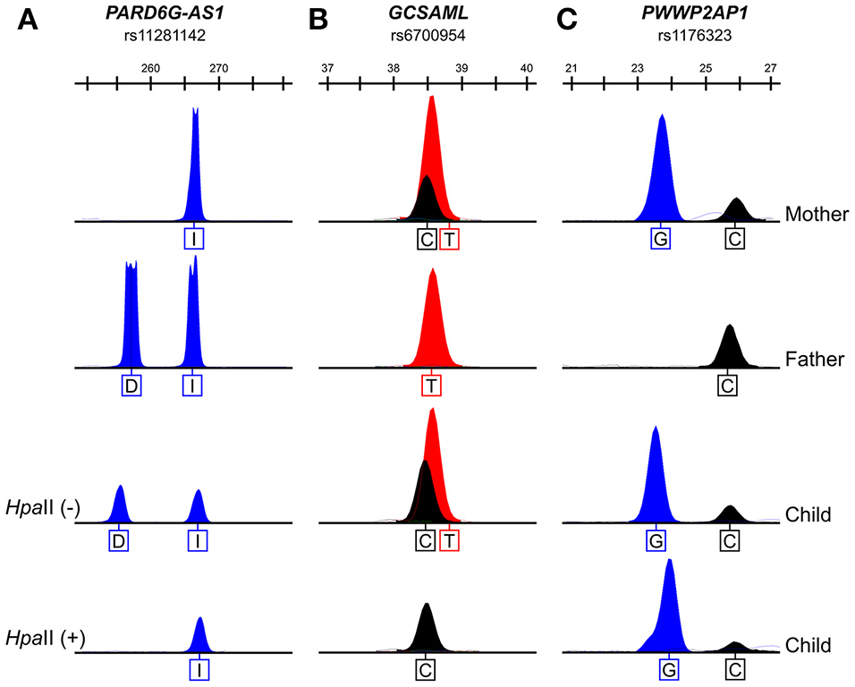 The 5mCpG sites at the PARD6G-AS1 and GCSAML iDMRs are on the maternally transmitted alleles. The maternally transmitted alleles and not the paternally transmitted alleles at the PARD6G-AS1(A) and GCSAML(B) DMRs are consistently methylated, as supported by the resistance of the maternally inherited alleles to digestion with the methylation-sensitive HpaII restriction enzyme and the lack of amplification of the paternally transmitted alleles from the digested genomic DNA samples for the informative variant SNPs (the PARD6G-AS1 upstream gene indel variant rs11281142 (I = insertion of CTGTGGTGC; D = deletion of CTGTGGTGC) and the GCSAML intron variant/upstream gene variant rs6700954, respectively) in three representative nuclear families that were informative for at least one SNP. Therefore, the 5mCpG marks in the PARD6G-AS1 and GCSAML DMRs are maternal imprints. On the other hand, both parental alleles of the PWWP2AP1 rs1176323 variant are resistant to digestion (C). Thus, the 5mCpG marks in the PWWP2AP1 CGI-1 occur in a parent-of-origin-independent manner. Given the intermediate rate of methylation in PWWP2AP1 CGI-1 (see Figure 5), the occurrence of 5mCpG sites in both parental alleles indicates that the PWWP2AP1 CGI-1 alleles are methylated in a stochastic fashion.