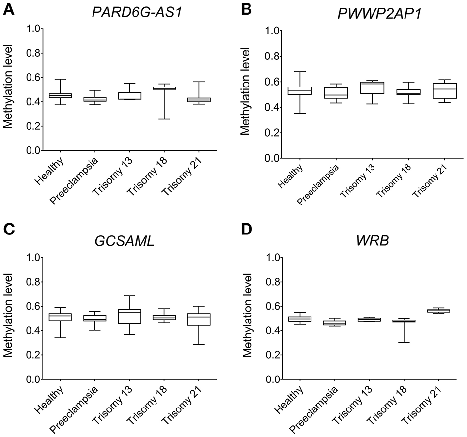 Absence of epipolymorphism at the PARD6G-AS1 and GCSAML maternal iDMRs in placentas from healthy and diseased pregnancies. The new maternal iDMRs are consistently hemimethylated in 450 K array (n = 90) methylomes from healthy; preeclampsia; and trisomy 13, 18, and 21 placentas. Comparison of the observed methylation levels in (A) the PARD6G-AS1 iDMR, (B) the PWWP2AP1 DMR, (C) the GCSAML iDMR, and (D) the WRB iDMR. Note that none of the conditions led to an unmethylated or hypermethylated status at the iDMRs. The hypomethylated status at the PARD6G-AS1 iDMR in some but not all trisomy 18 placentas suggests a paternal origin of the nondisjunction of the extra copy of chr18 in some placentas. The supernumerary chromosome 18 also perturbs the methylation status of the WRB iDMR in chromosome 21.