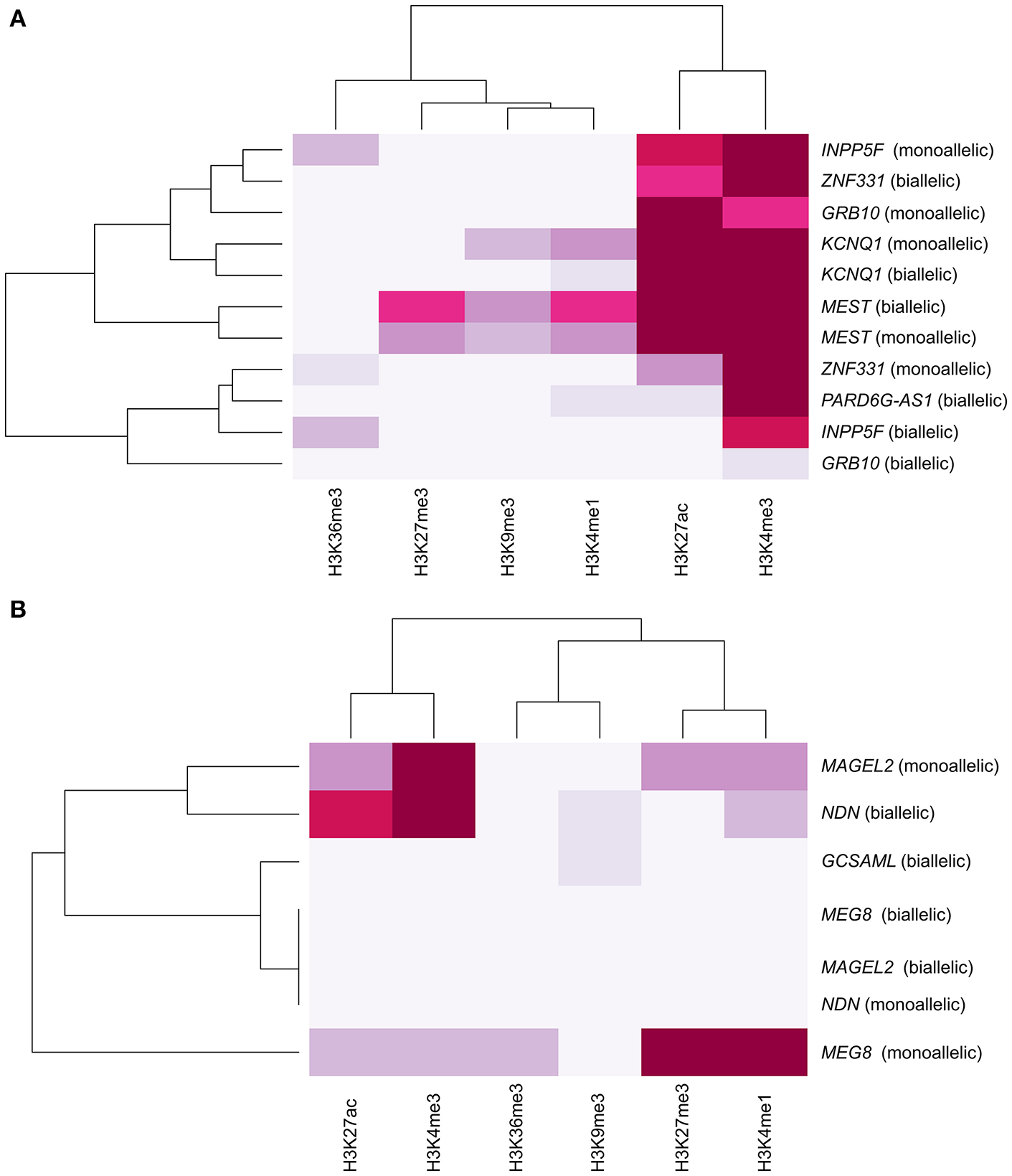 Absence of a tissue-specific histone modification enrichment signature at the PARD6G-AS1 and GCSAML iDMRs. Hierarchical clustering analysis of the histone modification enrichment profiles associated with maternal (A) gametic and (B) secondary iDMRs. The color intensity is correlated with the magnitude of the histone modification enrichment observed in tissues in which the genes are expressed either monoallelically or biallelically. Differential enrichment signatures in tissues with monoallelic expression are revealed for the GRB10, MEG8, and MAGEL2 iDMRs. The PARD6G-AS1 and GCSAML iDMRs were associated with contrasting chromatin segmentation marked by enrichment of activation and repression marks, respectively.