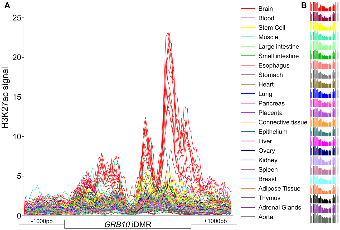 H3K27ac is differentially enriched at the GRB10 maternal iDMR in the brain. (A) Distribution of the H3K27ac activation mark across the GRB10 maternal iDMR in 22 tissues and one stem cell line. (B) A constitutively hemimethylated status is observed in all tissue methylomes. The line traces in (A) correspond in color to the tissue methylation profiles in (B). Despite the constitutive hemimethylated status, there is a brain-specific enrichment of H3K27ac, an activation mark, at the GRB10 iDMR; this enrichment is taken to be a differential signature of the active paternal allele in the brain.