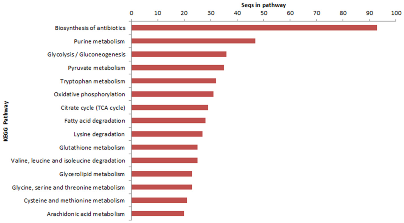 The transcripts characterization in the KEGG database demonstrated that 1,122 sequences were identified in 106 metabolic pathways. Genes involved in the biosynthesis of antibiotics, purine metabolism and glycolysis/gluconeogenesis were able to be highlighted (Figure 2).
