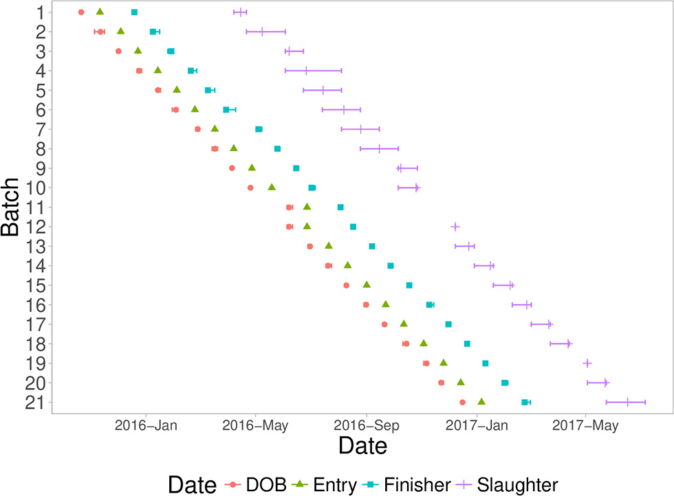 A fixed weight system was used to identify pigs for slaughter, starting at ~180 days of age. Pigs that were not heavy enough were delayed for three weeks and then evaluated again. Most batches took between two to four slaughter groups to slaughter all pigs from a batch. Figure 1 shows a timeline of all batches analyzed in this study, with timing of date of birth, entry into the first nursery, entry into the finisher, and slaughter dates.