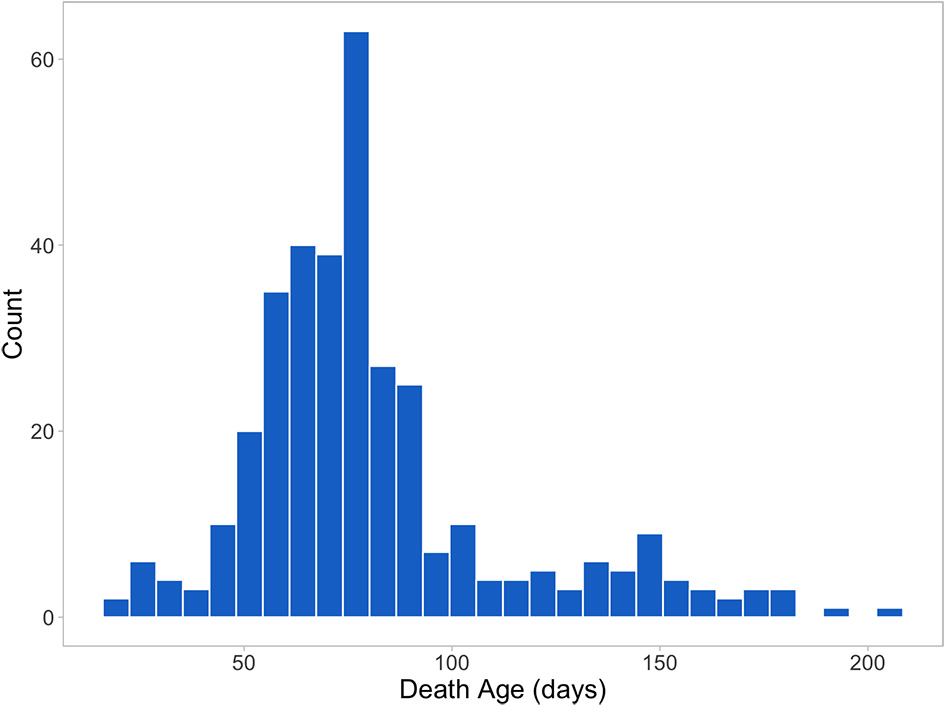 Figure 2 shows the distribution of death age for pigs that died prior to slaughter (344 or 26% of the 1,341 total animals). All treatment and mortality events and reasons were recorded (assigned by CDPQ research staff). Main treatment reasons included respiratory distress (thumping), gray/brown scours, coughing, lameness, yellow scours, arthritis, and failure to thrive/poor/skinny/hairy. Main mortality reasons included failure to thrive/poor/skinny/hairy, thumping/heavy breathing, sudden death, meningitis, and lameness/arthritis. Only individual treatments were included in the analyses and batch treatments were removed. Virtually all treatment reasons and ~89% of the mortality reasons were disease-related.