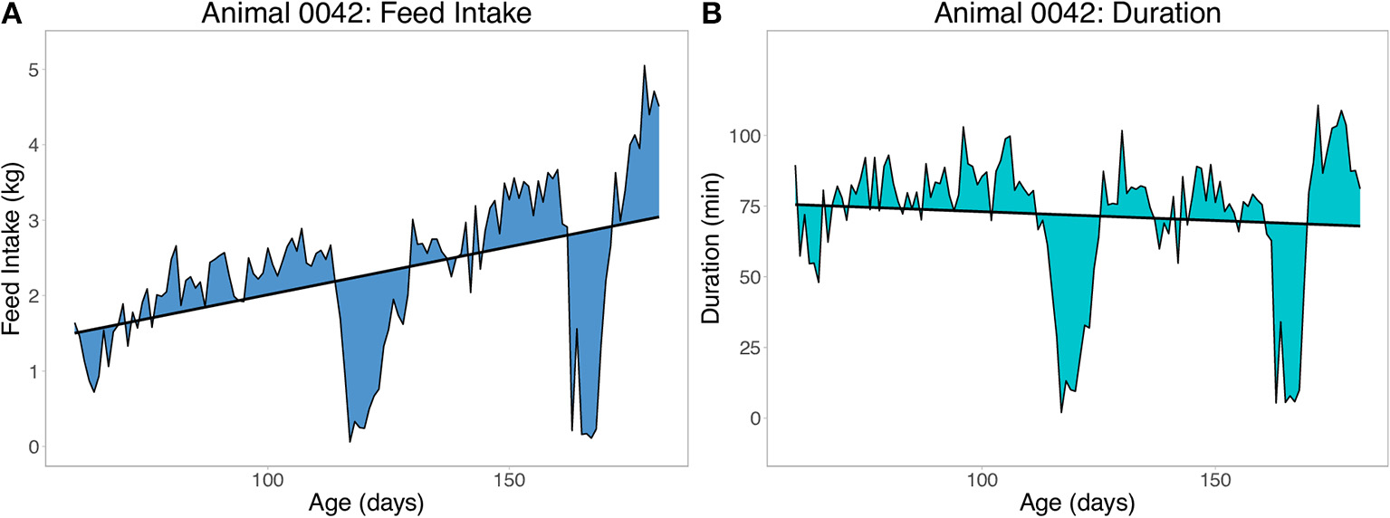 Two sets of resilience traits were derived from the daily FI data available for each pig. The first set of traits were derived as the root mean square error (RMSE) within animal from the regression of feed intake (FI) or duration (DUR) on age (RMSEFI and RMSEDUR, respectively), using ordinary least squares (OLS) linear regression. Duration is the daily time spent at the feeder in minutes. An example of the RMSE for one pig with two large deviations from illness is shown in Figure 3 for FI (Figure 3A) and duration (Figure 3B). To obtain a phenotype for RMSE, animals had to have a minimum of 60 days of FI recorded. A less resilient animal is expected to have a larger value for RMSE. Preliminary analyses showed that without setting this minimal number of days, animals that died early in finishing were grouped on the left side of the distribution of RMSE (i.e., they would be considered more resilient). Duration (time) at the feeder was chosen over traits such as number of meals due to its strong association with off-feed events (e.g., Figure 3).