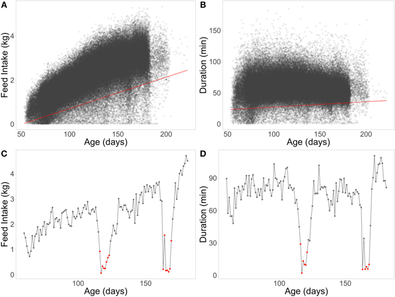 Quantile regression (QR) at the 5% level for feed intake (A) and duration (B). Example of classifying off-feed days for animal 0042 using QRFI(C) and QRDUR(D) in the lower panels. Red lines are the 5% QR for each FI (A) and duration (B). Red dots represent off-feed days used to calculate the QR phenotypes (proportion of off-feed days).