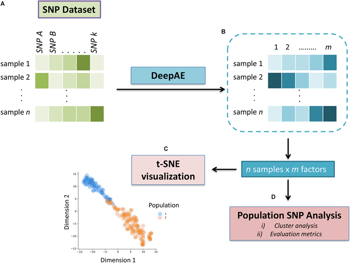 The t-distributed stochastic neighbor embedding (t-SNE) is a technique that allows visualization of high-dimension data giving each data point a location in a low dimension (Maaten and Hinton, 2008). This method maps the different high-dimension instances into new low-dimension instances keeping up the similarities found in the original data. Encoded SNPs with DeepAE were visualized by two-dimensional t-SNE implemented with perplexity = 30, iterations equal to 1,000, and a learning rate of 200.