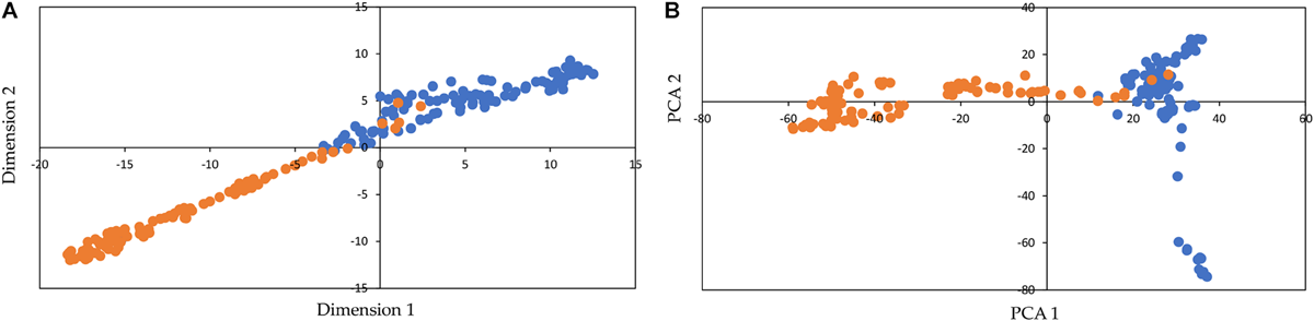 Visualization of the genetic structure of inbred lines of maize with t-distributed stochastic neighbor embedding (t-SNE) for the DeepAE (A) and representation of principal component analysis (PCA) (B) for single-nucleotide polymorphism (SNP) data. The colored dots orange and blue represent different inbred lines from the two subpopulations of maize (dent corn and popcorn, respectively).