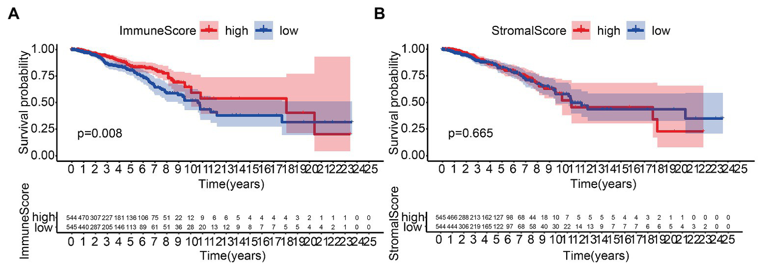 Correlation of scores with the survival of patients with breast cancer (BC). (A) Kaplan–Meier (KM) survival analysis for BC patients grouped into the high or low score in ImmuneScore determined by comparing the median. (B) Kaplan–Meier survival curve for StromalScore.