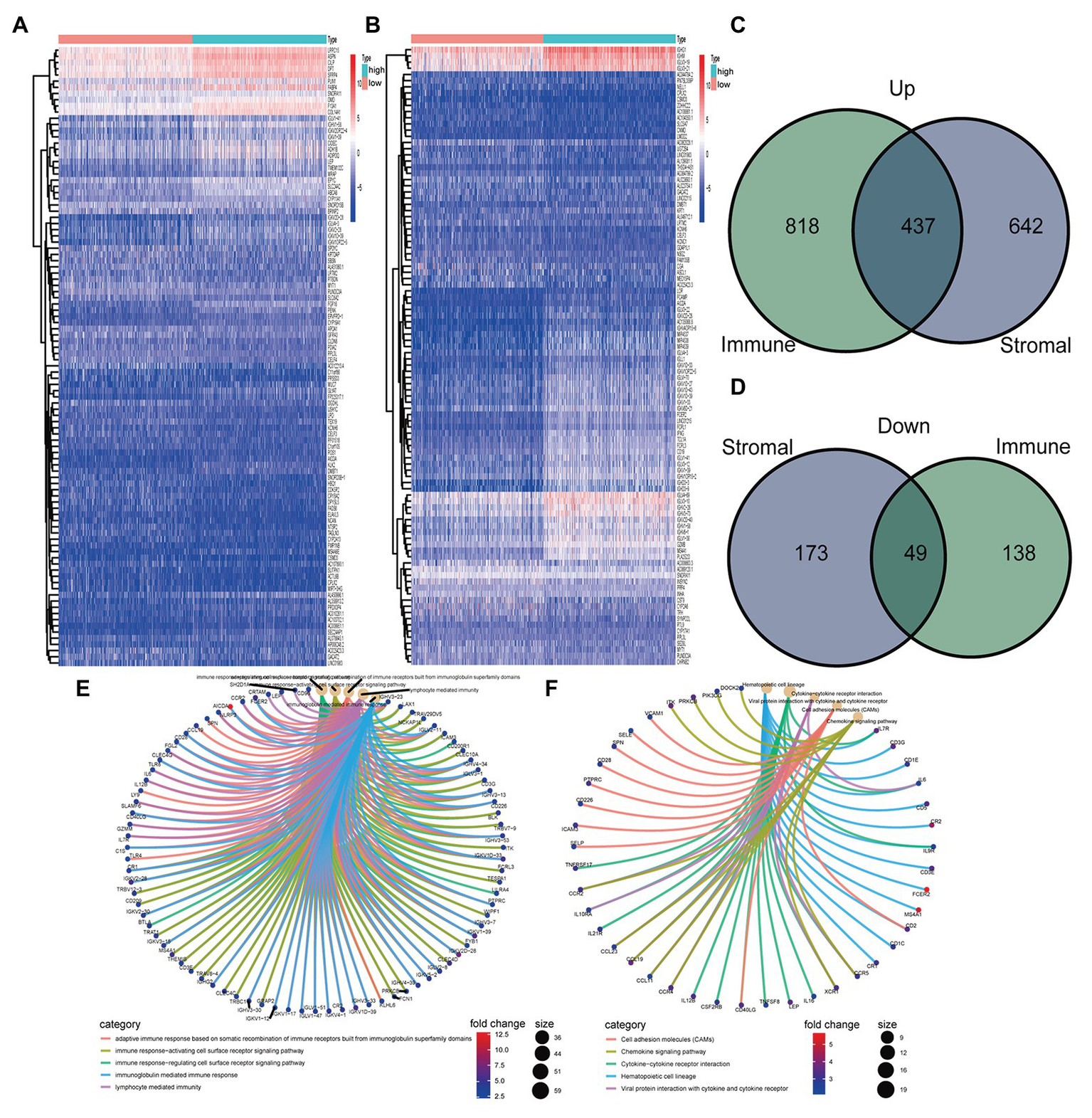 Heatmaps, Venn plots, and enrichment analysis of gene ontology (GO) and Kyoto Encyclopedia of Genes and Genomes (KEGG) for differentially expressed genes (DEGs). (A) Heatmap for DEGs generated in StromalScore. (B) Heatmap for DEGs in ImmuneScore. (C,D) Venn plots were showing common upregulated and downregulated DEGs shared by ImmuneScore and StromalScore. (E,F) GO and KEGG enrichment analyses for DEGs